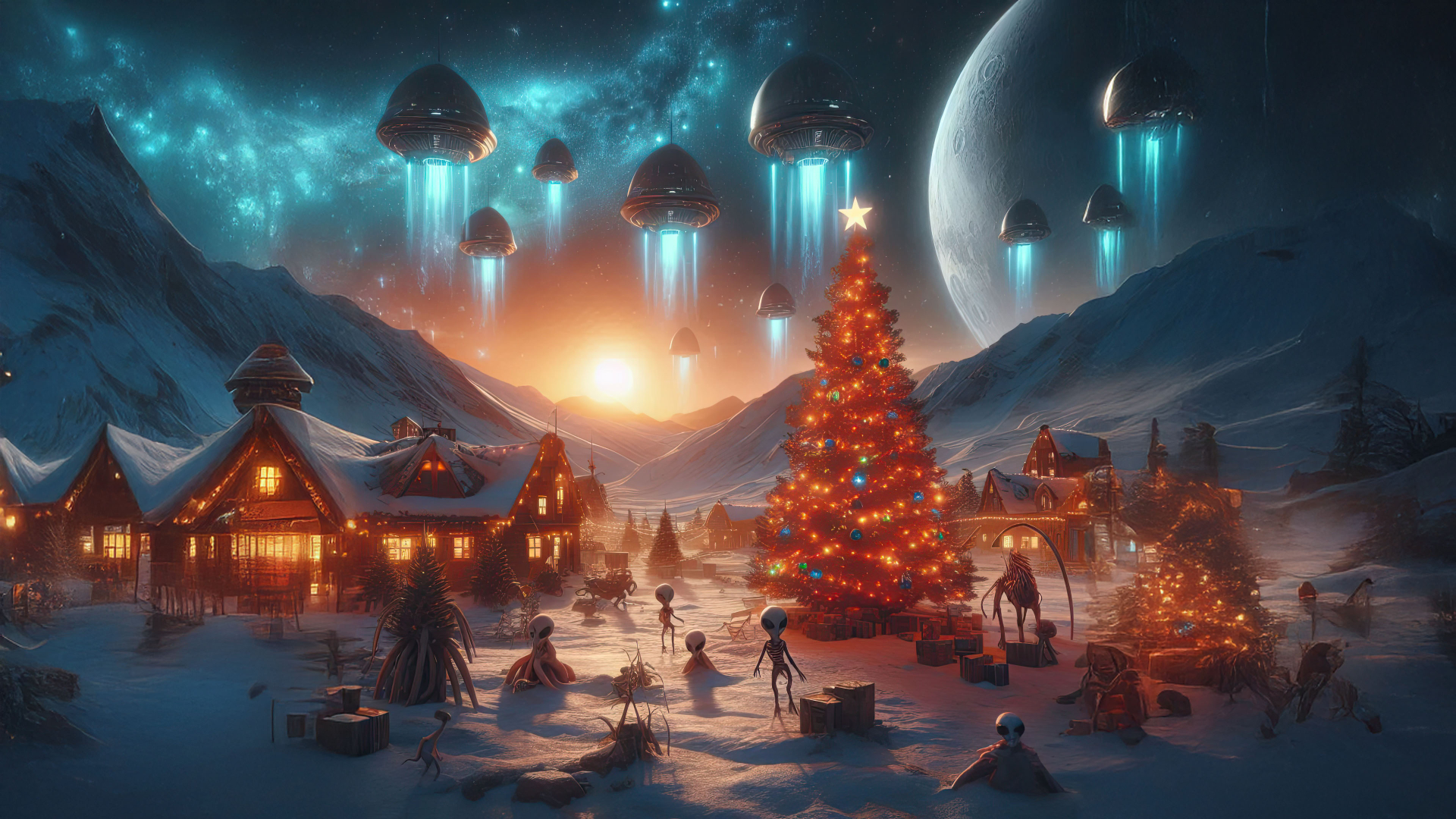 The peaceful winter landscape takes an unexpected turn as UFOs hover silently in the starry sky, their beams of light creating an ethereal atmosphere. The contrast of traditional holiday elements and sci-fi visuals adds a unique touch of wonder.