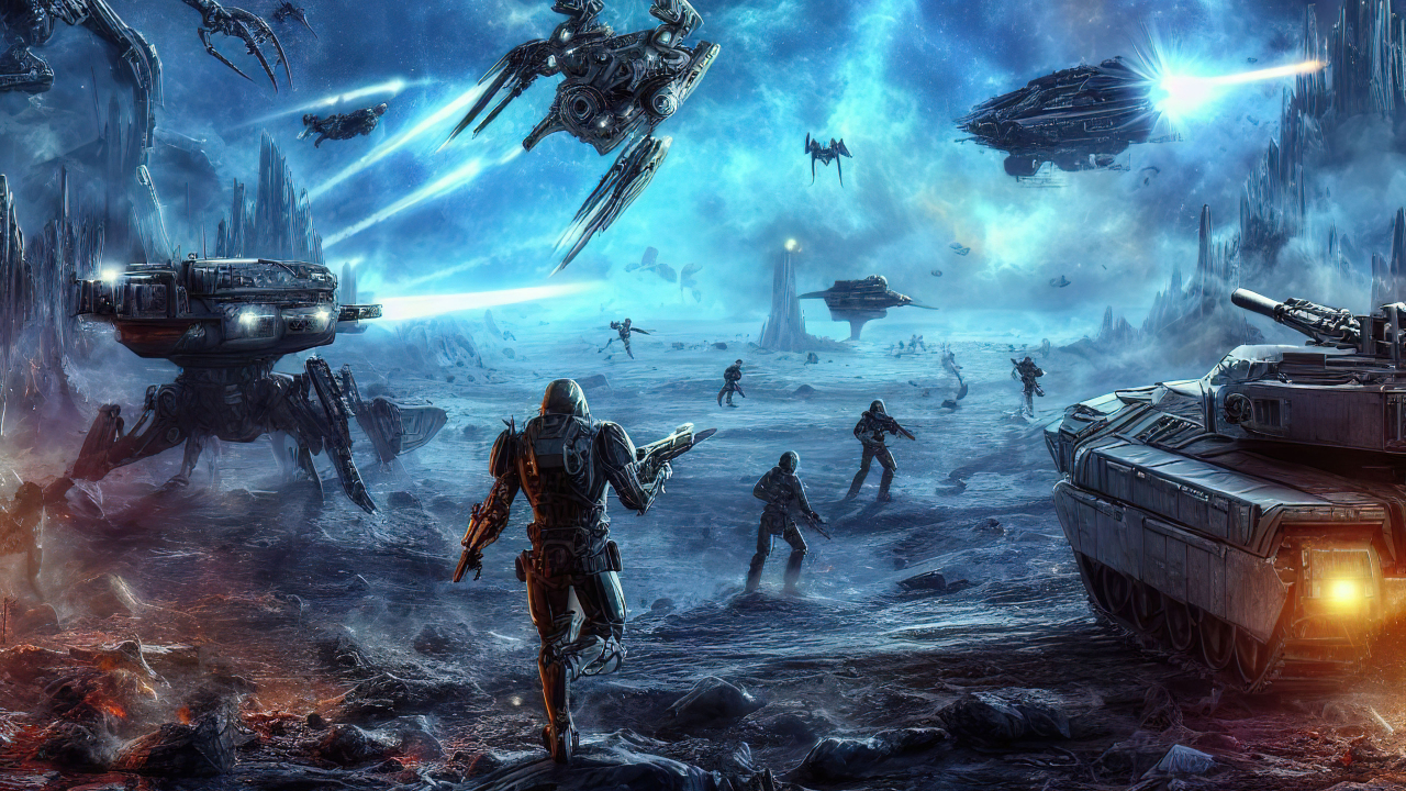 Immerse yourself in the thrilling world of alien invasion with our captivating wallpaper. This fantasy sci-fi scene depicts an intense battle as aliens attack the planet, deploying infantry on the ground and space ships in the air. Experience the adrenaline of the unknown as you witness the clash between worlds in this mesmerizing and action-packed wallpaper.