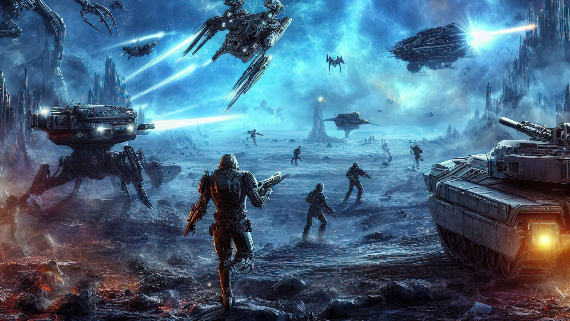 As the alien invasion unfolds, the wallpaper captures the intensity of the battle. Ground forces of infantry engage in combat on the planet's surface, while futuristic space ships dominate the skies, creating a visually stunning and dynamic scene that draws you into the heart of the action.