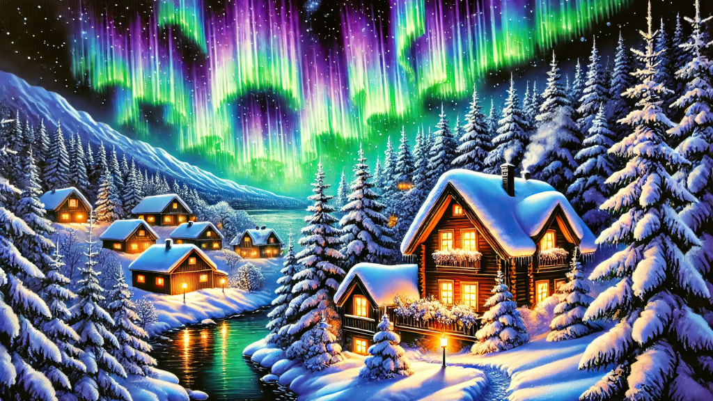 The snow-covered cottages and trees, combined with the reflection of the Aurora Borealis on the icy river, create a picturesque winter scene. The glowing windows of the cottages add warmth to the cold landscape.