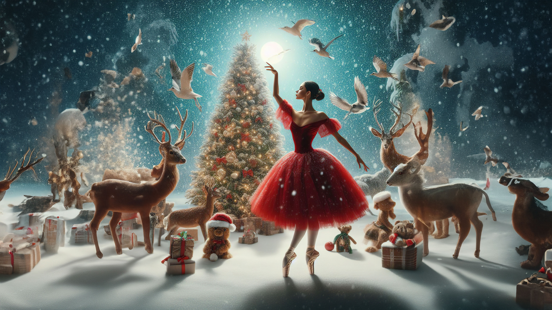 Enchanting Ballet: Ballerina Dances in Red Dress Surrounded by Animals