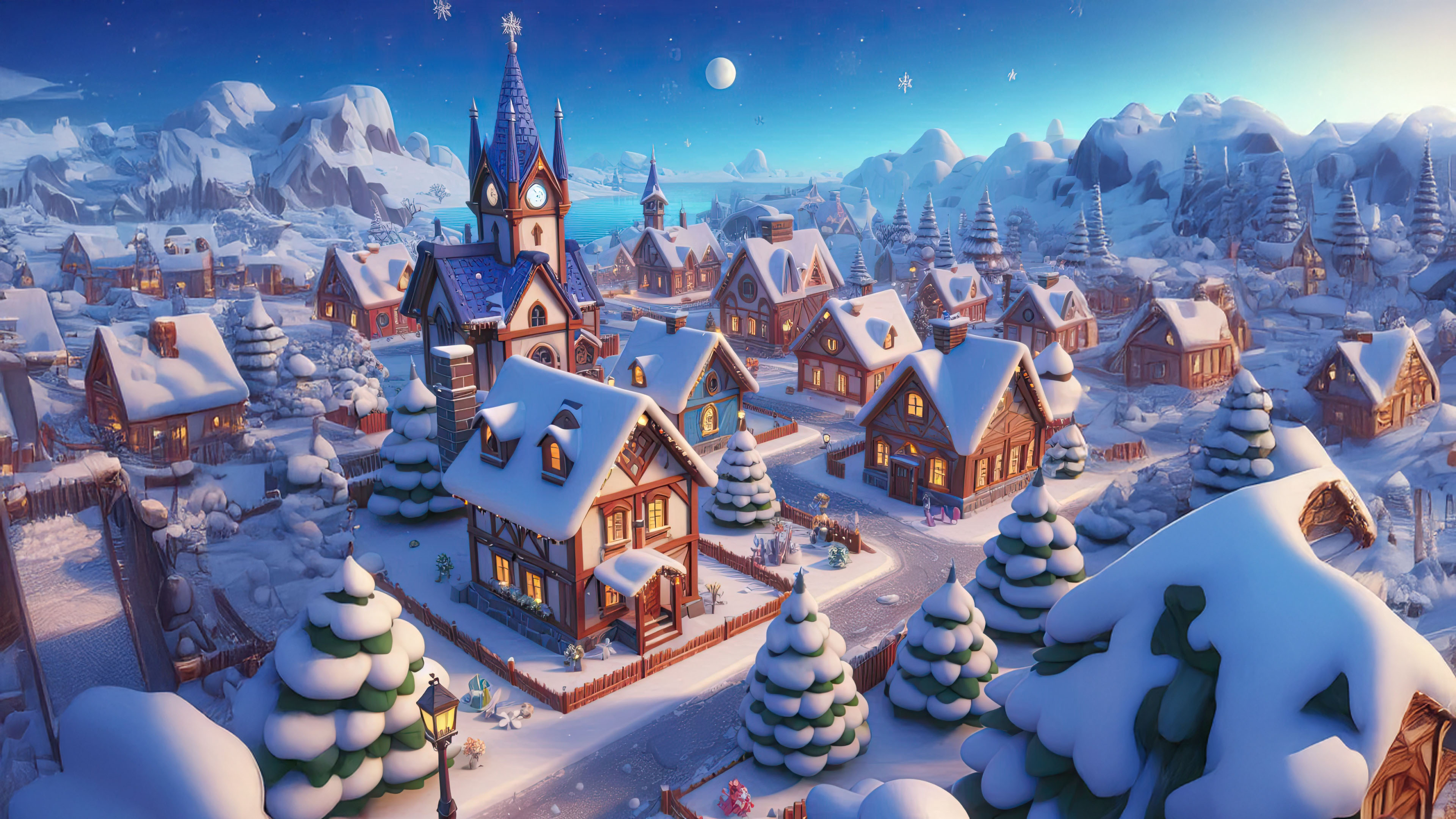 The clock tower and carefully arranged snow-covered trees add character to the charming village. The serene night sky with its glowing moon enhances the magical winter ambiance.