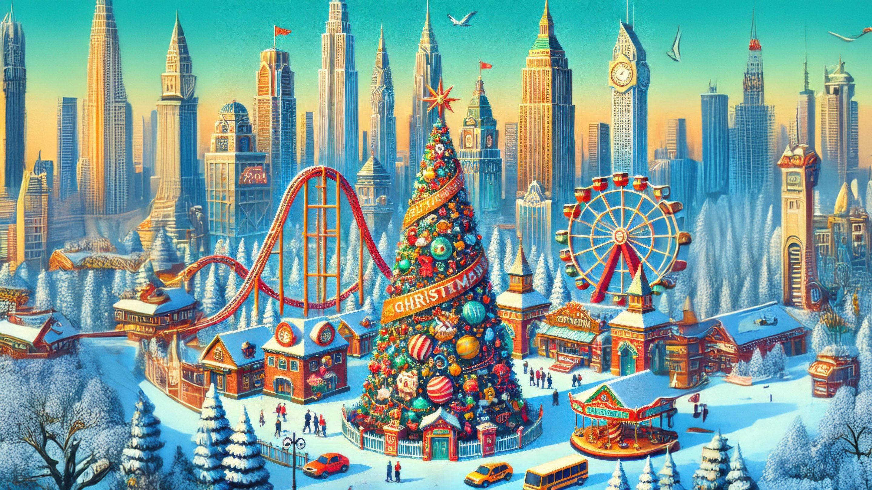 The roller coaster, Ferris wheel, and carousel bring the holiday spirit to life, offering a playful blend of winter wonderland and city vibrancy. The snow-covered trees and urban skyline complete the enchanting scene.