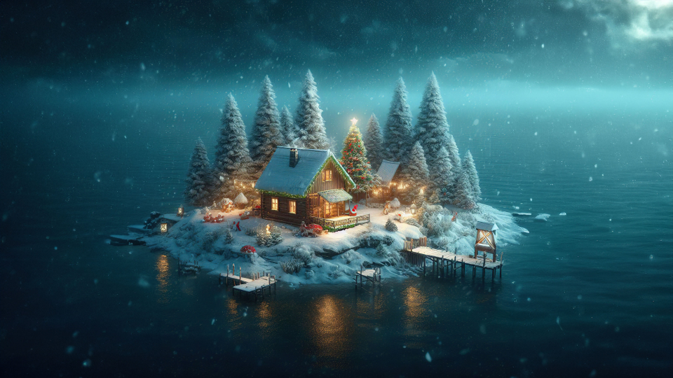 The wallpaper invites you to a winter paradise, where a snow-covered island becomes the canvas for a serene retreat. The scene unfolds with a quaint cottage, adorned with festive lights, and a Christmas tree that radiates the warmth and joy of the season.