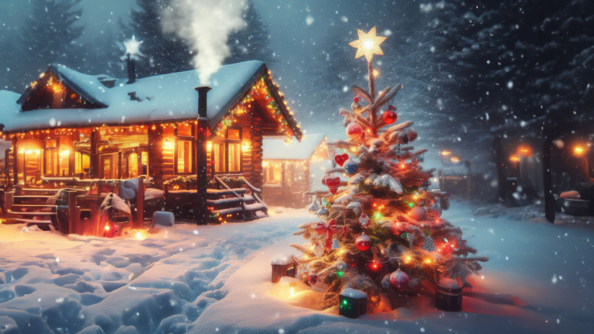 Immerse yourself in the magic of the holiday season with our enchanting wallpaper showcasing a cozy winter cottage adorned with lights, surrounded by pristine snow. Picture the festive atmosphere with a beautifully decorated Christmas tree, aglow with colorful lights. Experience the warmth and joy of Christmas as you transform your screen into a window to this winter wonderland.
