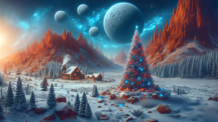 Whether you're looking to bring a unique twist to your holiday decorations or simply want a serene and futuristic wallpaper, this cosmic winter wonderland captures the spirit of the season in an entirely new way.