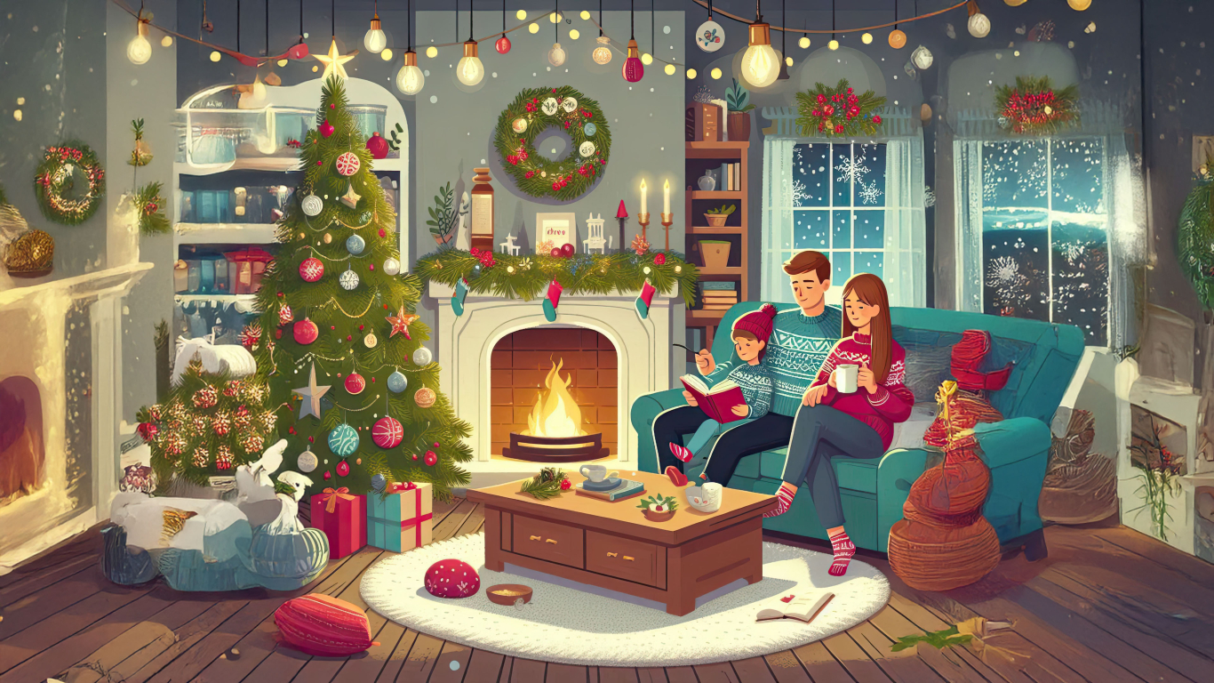 Step into a scene filled with love and joy, where a family gathers in a cozy living room adorned with Christmas decorations and a glowing tree.