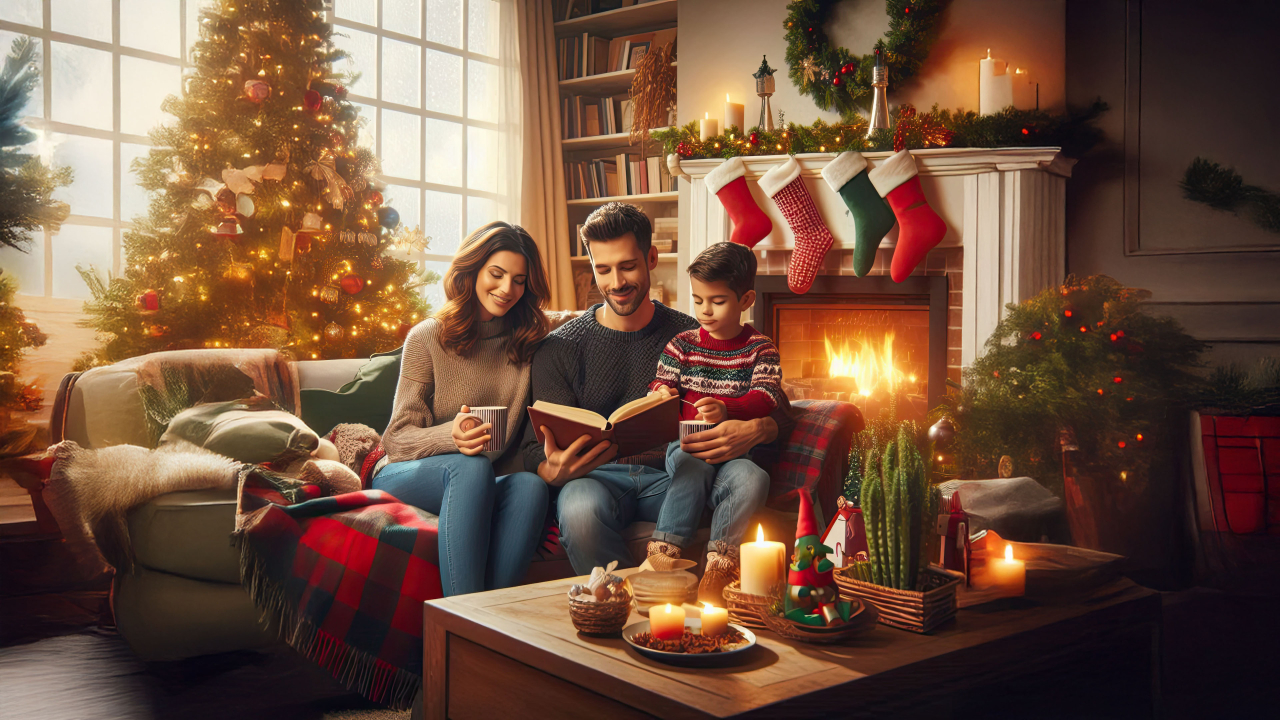 This image captures the essence of Christmas with a family enjoying the festive spirit by the fire.