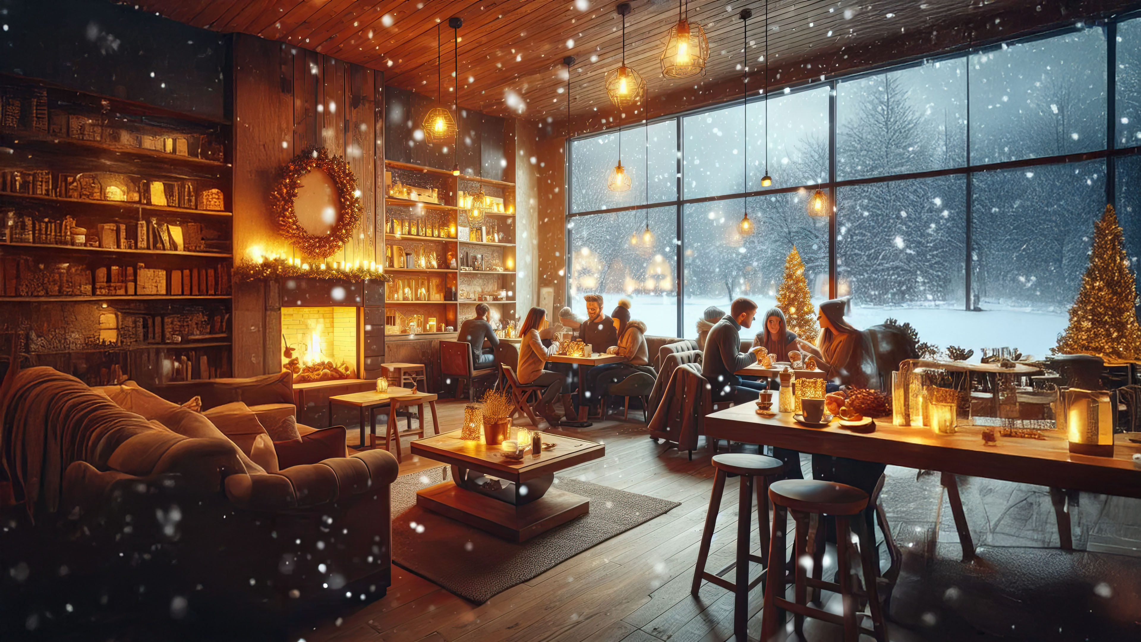As the snow blankets the ground outside, the allure of a cozy winter cafe becomes irresistible. This image captures the essence of warmth and comfort, with a roaring fireplace and soft lighting creating an inviting atmosphere.
