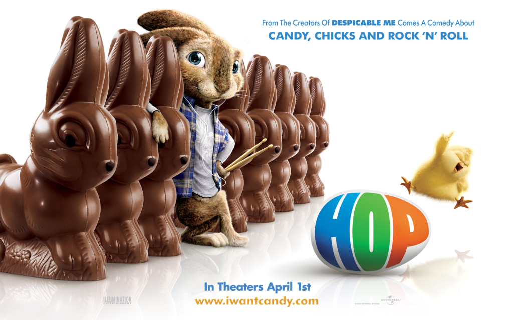 Hop is a live-action/animated hybrid family comedy film released in 2011. Directed by Tim Hill, the film tells the story of E.B. (voiced by Russell Brand), the teenage son of the Easter Bunny, who decides to pursue his dream of becoming a drummer and leaves Easter Island for Hollywood. There, he crosses paths with Fred O'Hare (James Marsden), an out-of-work slacker, and together, they embark on an adventure that could jeopardize Easter for everyone.