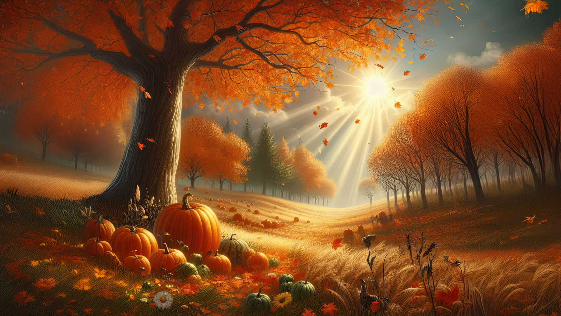 This stunning wallpaper captures the essence of autumn with a picturesque landscape. A large tree with vibrant orange leaves stands in the foreground, casting shade over a collection of pumpkins. Sunlight streams through the foliage, illuminating golden fields and creating a tranquil fall atmosphere.