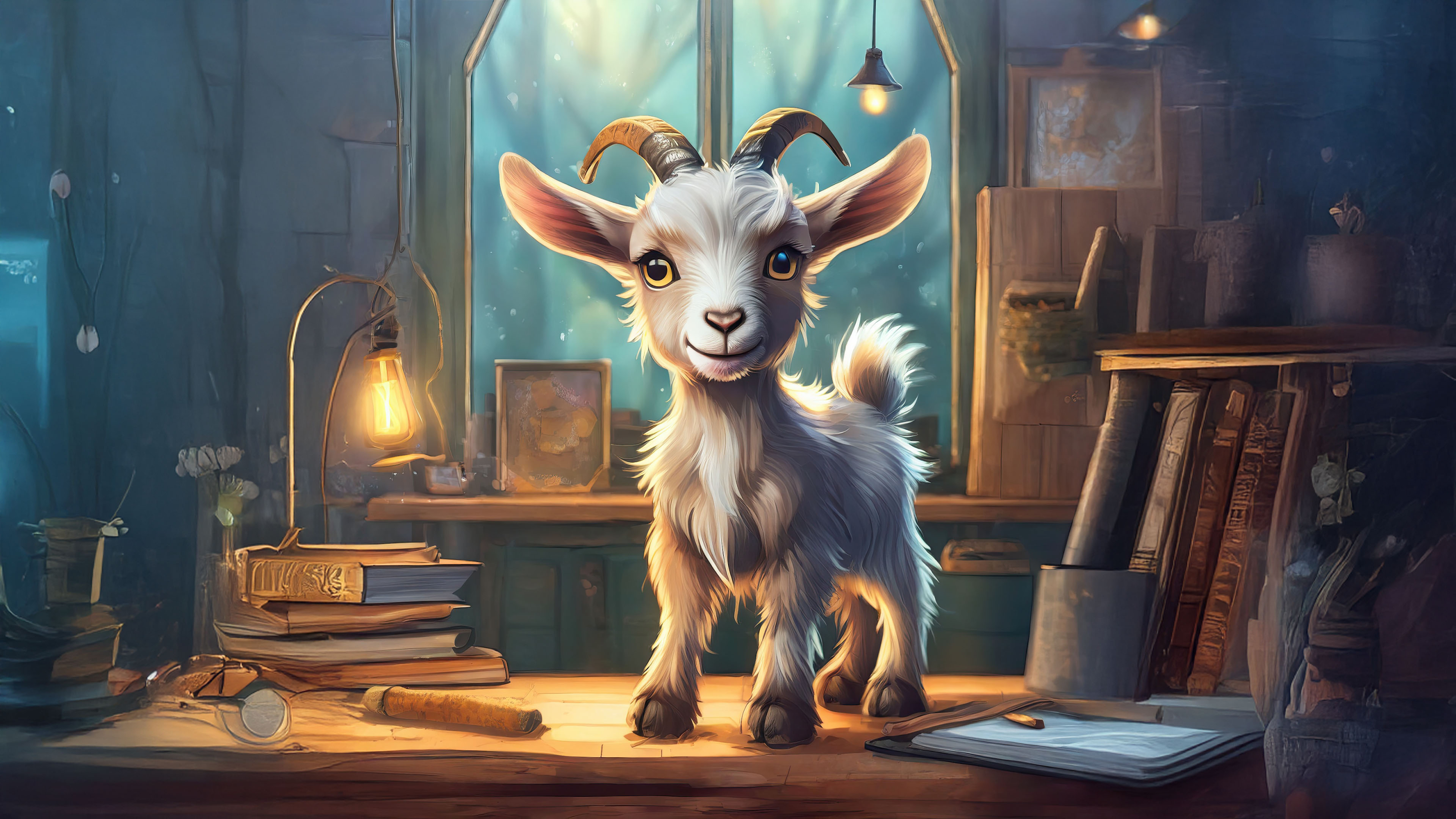 This image captures the charm of a curious little goat exploring a warm and cozy study, offering a glimpse into a whimsical world.