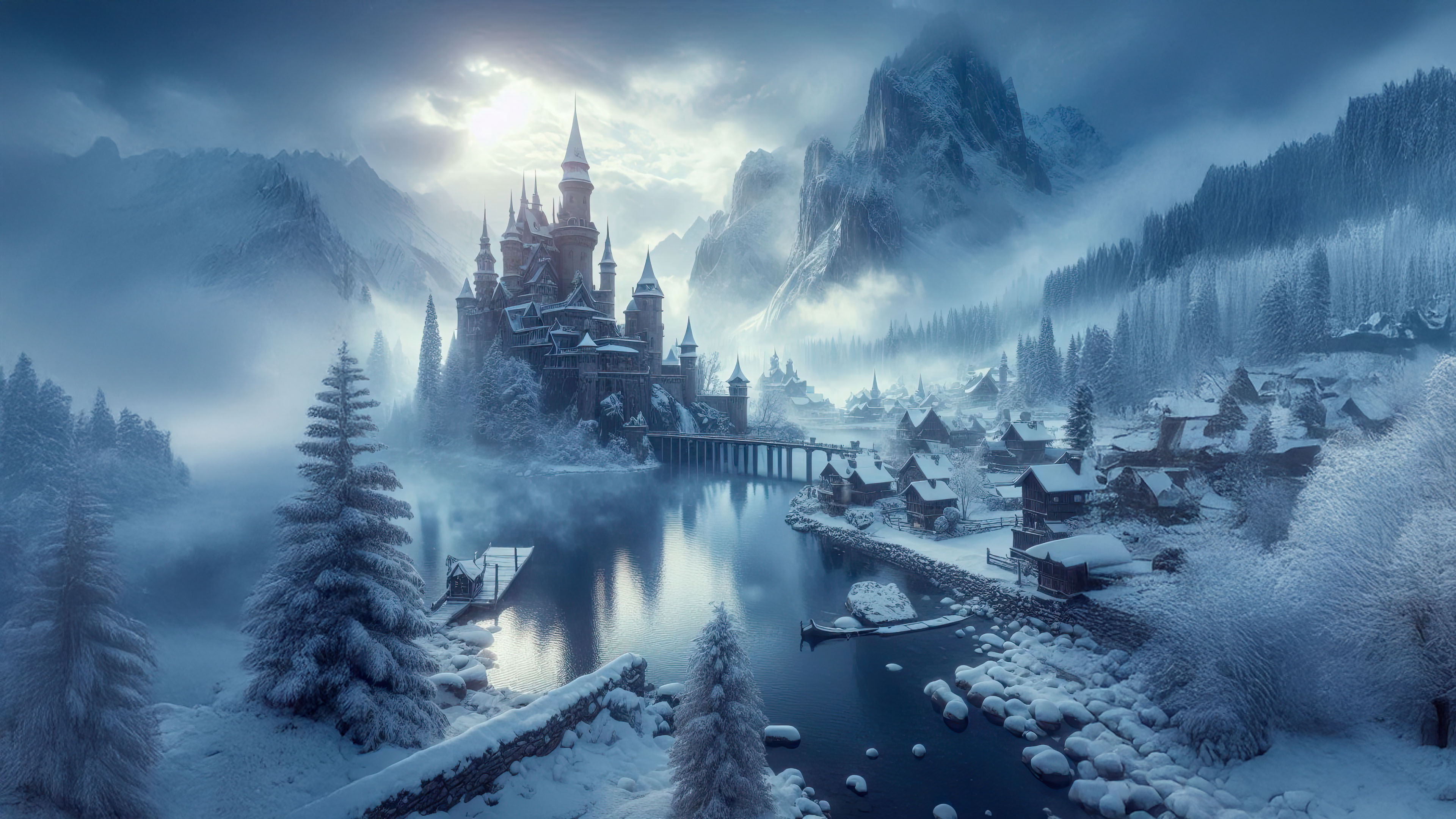 Journey into a magical winter setting, where a majestic castle stands amidst snowy mountains and a tranquil village. The misty atmosphere and serene reflections add to the mystical charm of the scene.