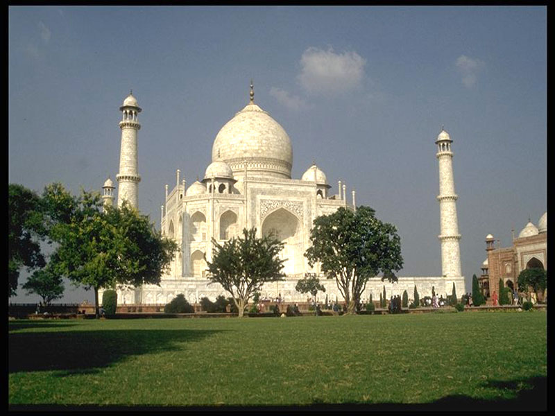 Taj Mahal Wallpaper is free to download high quality desktop and mobile wallpaper with many resolutions up to 800x600 pixels The origin of the name Taj Mahal is not certain. Court histories from Shah Jahan's reign only call it the rauza (tomb and mosque complex) of Mumtaz Mahal. It is generally believed that Taj Mahal (literally translated as "Crown Palace" or "Crown of the Palace") is an abbreviated version of Mumtaz's name. [1] (http://rubens.anu.edu.au/student.projects/tajmahal/hist_sign.html). Today, it is sometimes simply and evocatively referred to as - the Taj. The Taj Mahal was constructed using materials from all over India and Asia. Over 1,000 elephants were used to transport building materials during the construction. The white marble was brought from Rajasthan, the jasper from Punjab and the jade and crystal from China. The turquoise was from Tibet and the Lapis lazuli from Afghanistan, while the sapphire came from Sri Lanka and the cornelian from Arabia. In all, 28 types of precious and semi-precious stones were inlaid into the white marble. The total cost of construction was about 40 million Rupees, at a time when 1 gram of gold was sold for about 1.3 Rupees. Details of the outside wallThe architectural complex of the Taj Mahal covers an area of approximately 1900'x 1000' and comprises of five main components: the darwaza (gateway), the bageecha (garden) which is in the form of the typical Mughal charbagh (garden divided into four parts), the masjid (mosque), the mihman khana (guest house), and finally the mausoleum or the tomb of Taj Mahal, at the Northern end of the complex. Schematic plan of Taj complexThe tomb complex was designed to be accessed from both the Northern and the Southern sides, from the river Yamuna as well as by land. The entry from the landside has the gateway and other utility buildings constituting the front (and Southern) part of the complex. On entering the gateway which visually frames the tomb, one is inside the charbagh. Measuring 1000' x 1000', the garden has sunken parterres or flower-beds, raised pathways, water channels that reflect the Taj and avenues of trees. At the termination and along the central axis articulated by the garden is the tomb. To the Western or Mecca side of the tomb is a mosque of red sandstone that sanctifies the complex and provides a place for pilgrims to worship. On the Eastern side is a structure that duplicates the mosque in order to maintain architectural symmetry. This is known as the jawab ("answer") and was put to use as a guest house. Gateway to the Taj Mahal, view from CharbaghThe tomb of Queen Mumtaz Mahal stands on a raised terrace with four minarets at each corner framing the tomb. The minarets are believed to slant outwards so that in the event of an earthquake they will fall away from the tomb. Like most Mughal tombs, the Taj shows a lot of Persian influence. A derivative of a square in plan with edges chamfered, it is a multi-chambered structure with a central main chamber surrounded by eight divisions ( of which four are important bays) with openings in the form of arched alcoves. The central chamber is surmounted by a bulbous double dome (having inner and outer layers) generally referred to as the onion or Tartar or Persian dome because of its form. There are four chattris (small domes over pavilions) over the surrounding bays which articulate the main dome. The cenotaph is at the entry level of the main chamber whereas the grave is at the level below. The black and white chessboard marble floor inside the tomb chamber and the pietra dura artwork that includes geometric patterns, plants & flowers are impressive. Various studies on the Taj speculate on what makes it unique and beautiful. One reason is attributed to its perfect proportions and geometry. Another is ascribed to the various moods that the Taj presents to its viewers. Clad in delicate, white Makrana marble, the Taj changes its character across time as the light changes- dawn, noon, twilight, night. The shadows that fall on the marble too enhance the effect, being very delicate. The Taj is considered especially etheral when viewed on a full moon night. For Tagore, the Taj was a "tear in the face of eternity". Taj Mahal, view from South-Eastern gardensAn unlikely legend claims that after the completion of the Taj Mahal, Shah Jahan had the eyes of architect Ustad Ahmed gouged, ensuring that nothing could be built competing with its magnificence. An identical complex was originally supposed to be built on the other side of the river, in black marble instead of white. There is some archaeological evidence to support this theory. If plans for such a structure did exist, however, it was never completed for unknown reasons. As part of the struggle for succession, Shah Jahan was put under house arrest at nearby Agra Fort by his son Aurangzeb, and legend has it that he spent the remainder of his days there gazing from a window at the Taj. He was buried in the Taj Mahal, next to his wife. By the late 19th century, parts of the Taj Mahal had fallen badly into disrepair, and some of the cut marble had been stolen for use elsewhere. British viceroy Lord Curzon ordered a restoration project. At the same time the traditional garden was replaced with the more English-looking lawns that are visible today. The Taj Mahal, as of 1983, is an UNESCO World Heritage Site and a major tourist destination (source: www.wikipedia.com)