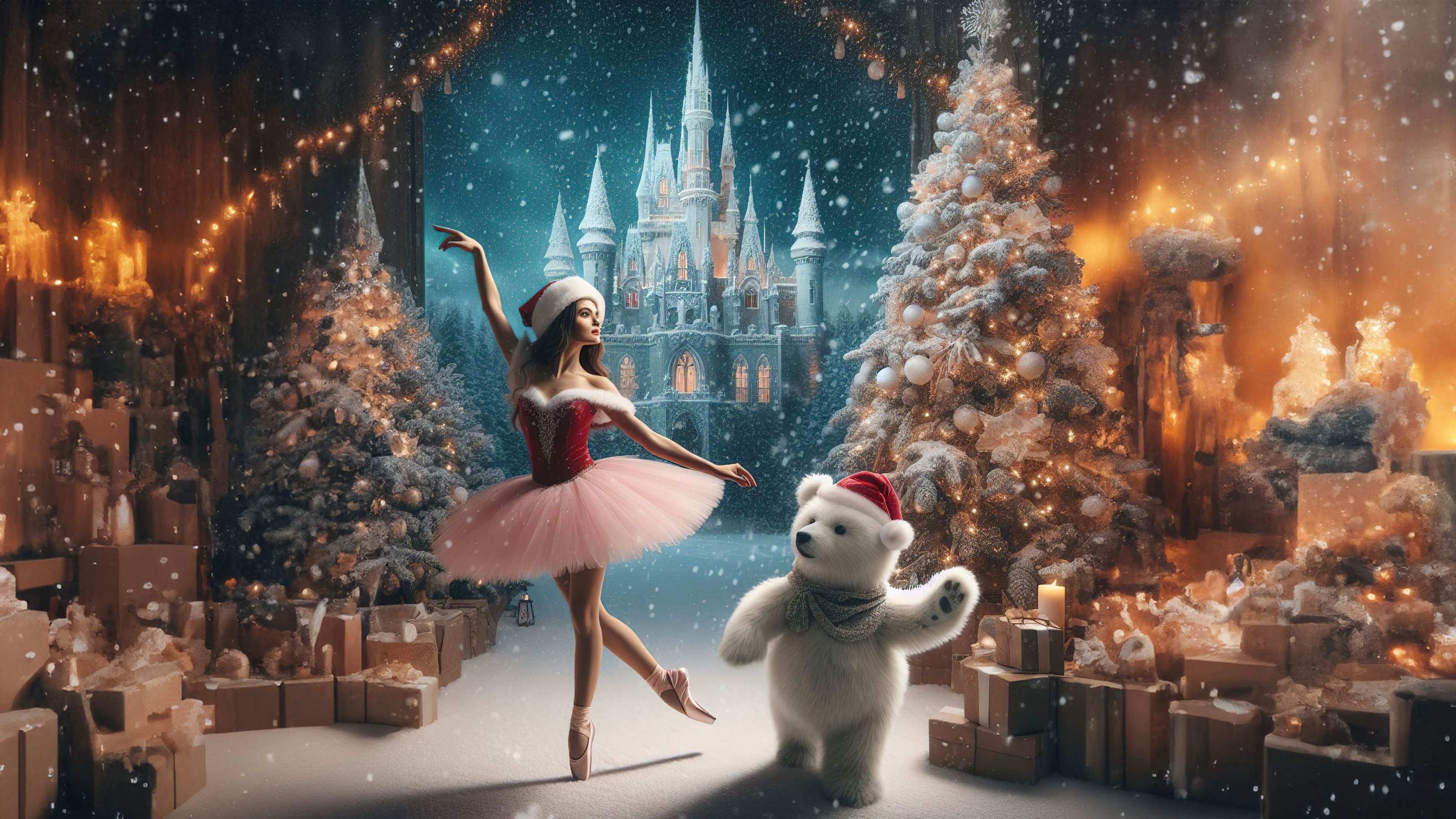 Enchanted Dance: Christmas Ballerina and White Teddy Bear in a Whimsical Ballet