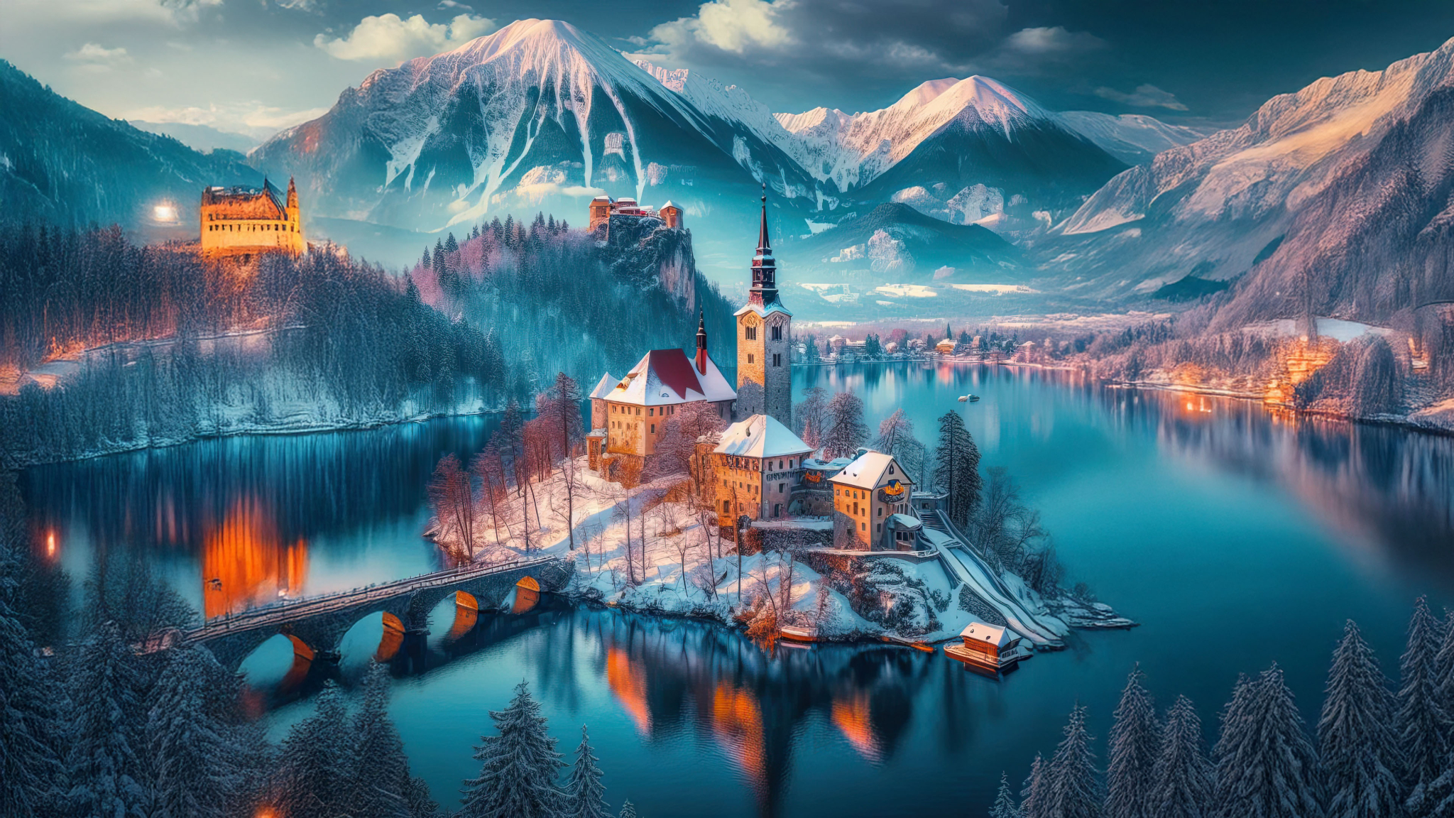 Discover the timeless beauty of an enchanted winter castle, a serene escape surrounded by snow-capped mountains and tranquil waters. This idyllic destination is the perfect retreat for those seeking a touch of magic in their winter travels.