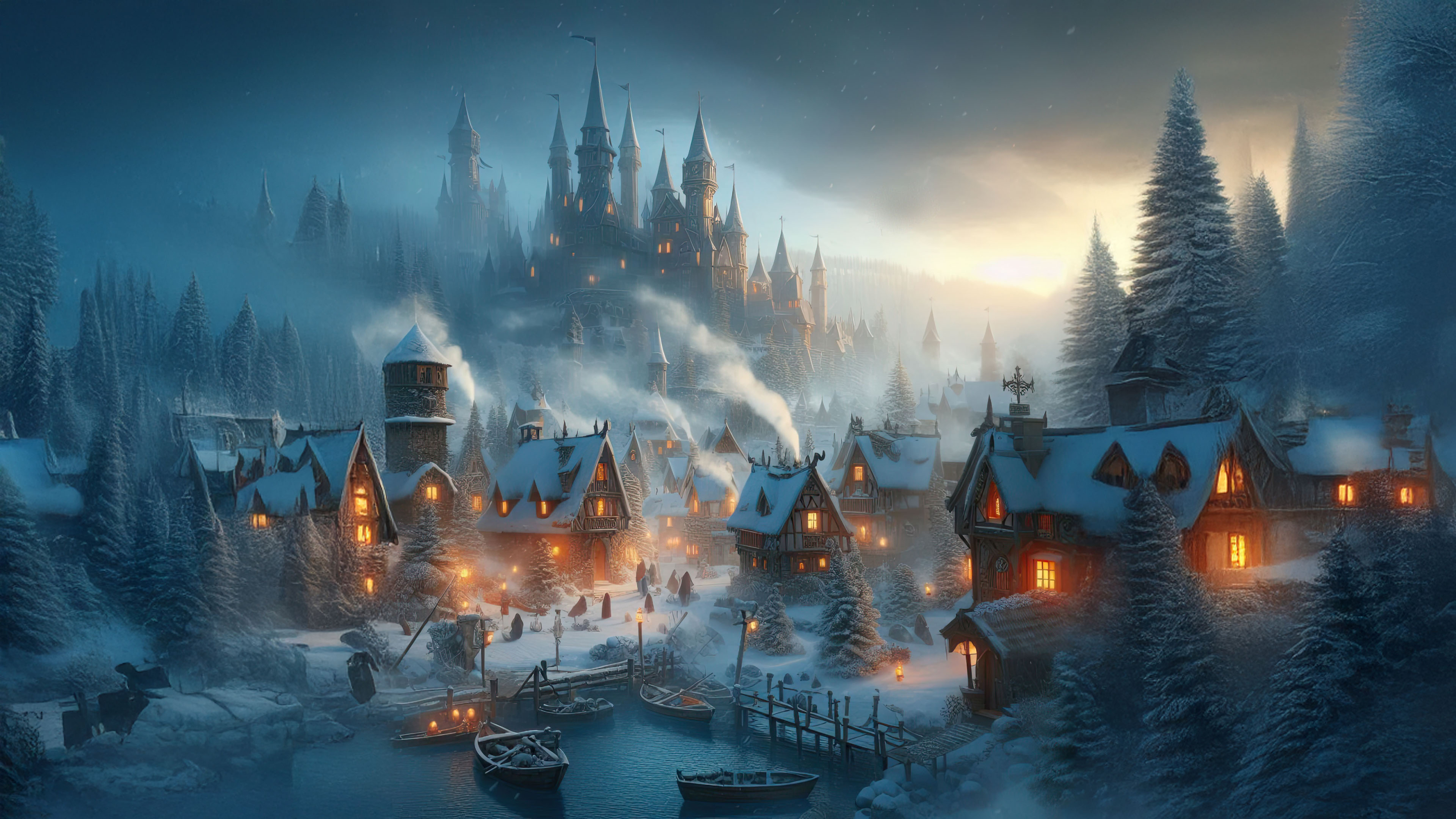 Set in a picturesque snowy landscape, this image transports viewers to a serene and magical world. The village's quaint cottages and the towering castle make it a dreamlike destination for anyone seeking the perfect fairy tale setting.