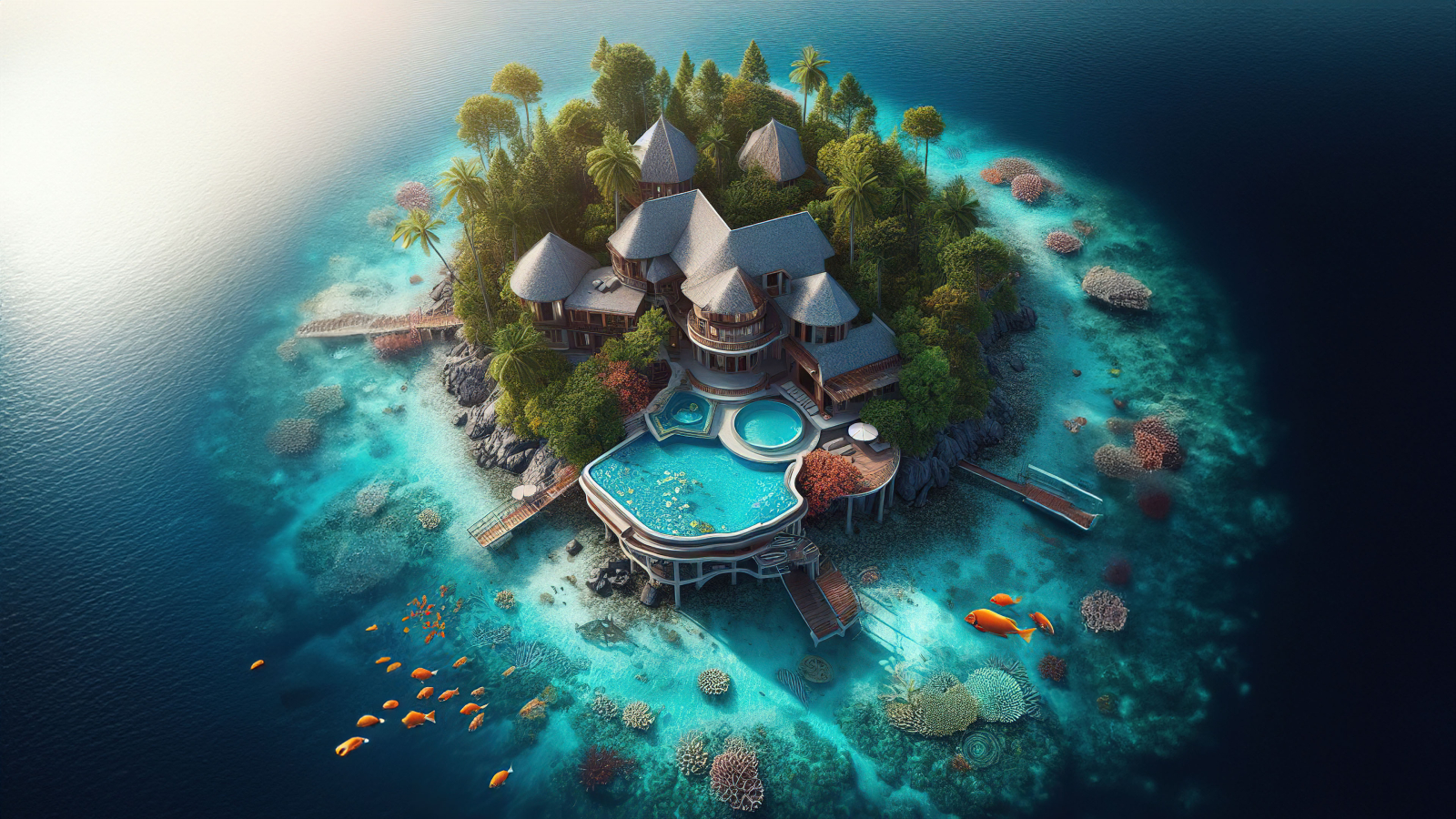 The clear waters reveal a coral reef brimming with life, taking the concept of 'ocean view' to extraordinary depths. Schools of vibrant fish dart between the corals, providing an ever-changing palette of color. This captivating underwater scene, visible from the island’s docks, suggests a paradise for snorkelers and divers alike in what could be the world's most exclusive virtual resort.