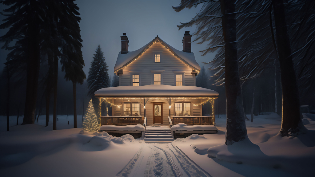 Immerse yourself in the warmth of the scene as the house stands out against the snowy backdrop. The contrast between the festive lights and the white expanse of snow creates a captivating tableau, evoking the magic and charm of a winter day filled with Christmas spirit.