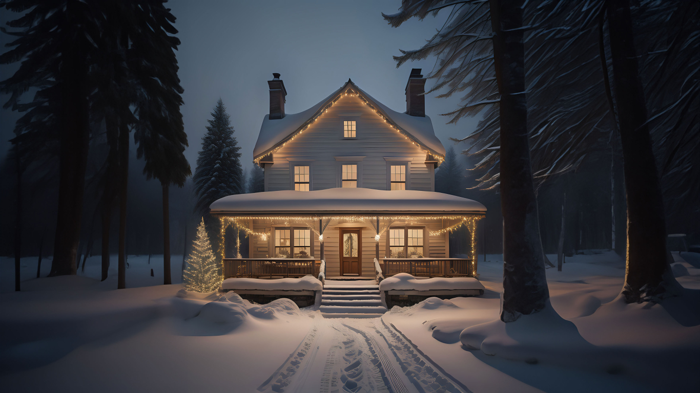 Create a cozy winter atmosphere with our charming wallpaper featuring a house adorned with Christmas lights and ornaments on a snowy day. Picture the enchanting scene as the house becomes a beacon of warmth and festive cheer against the snowy backdrop. Transform your screen into a window to this winter abode and infuse it with the magic of a snowy Christmas day.