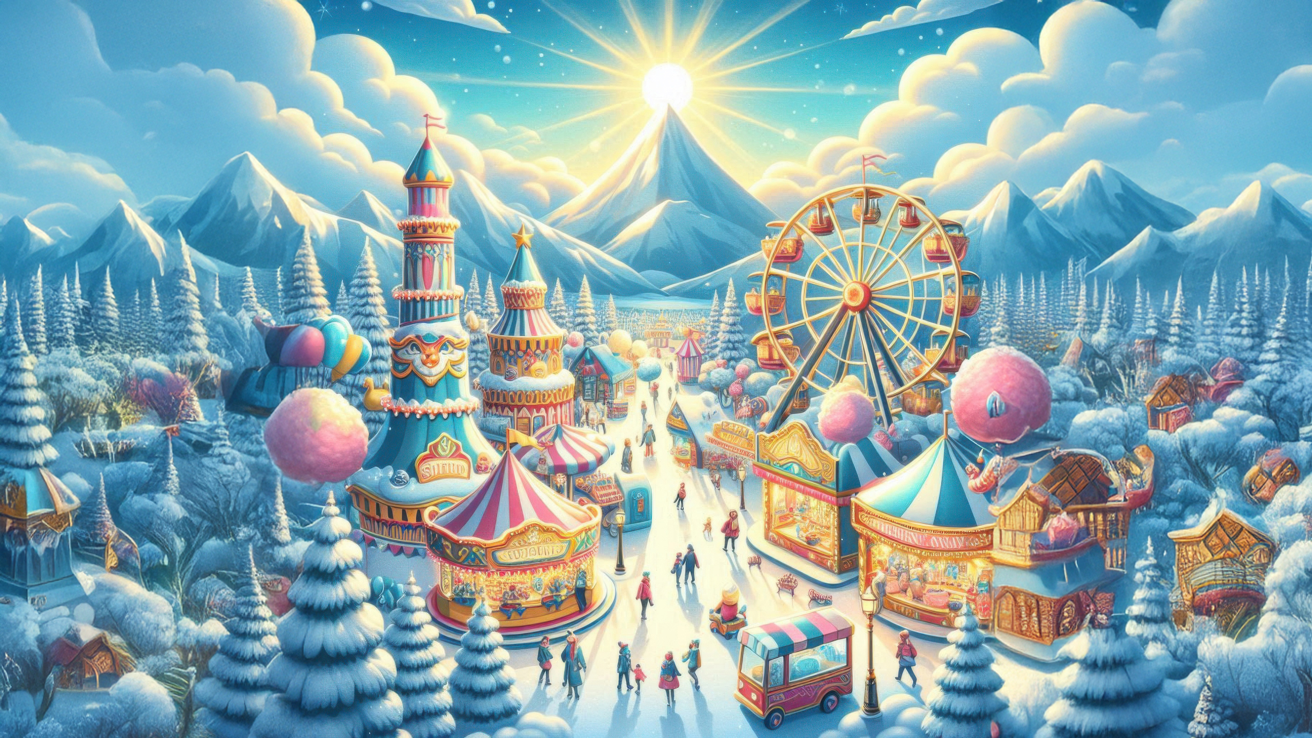The carnival is set against a breathtaking winter backdrop of snow-covered pine trees and majestic mountains. The clear blue sky, lit by the radiant sun, adds warmth and brightness to the festive scene, making it a perfect blend of winter charm and holiday joy.