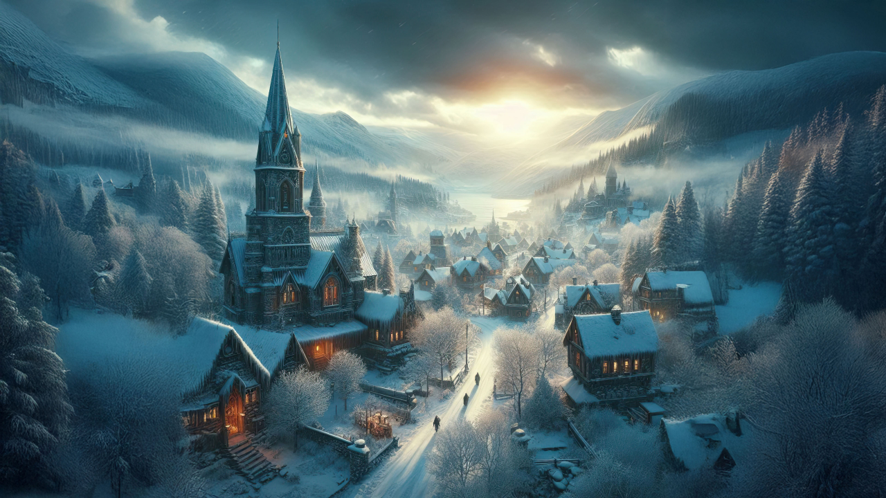 The towering steeple and quiet streets create a picturesque scene of tranquility and charm, perfect for a winter getaway.