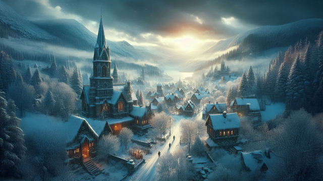 This image captures the serene beauty of a winter village as the morning sun rises, illuminating the frosted rooftops and hills.