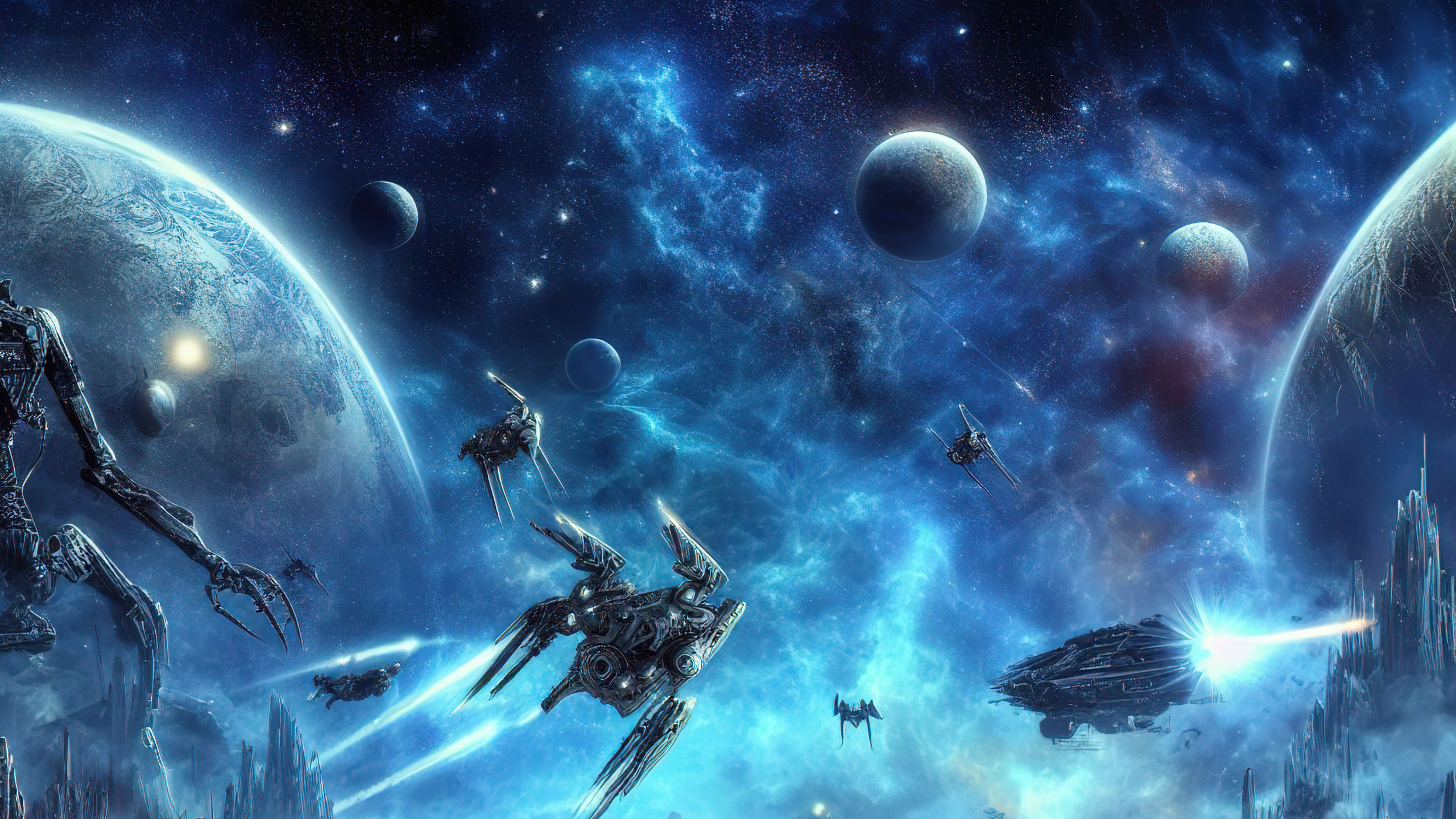 Experience the thrill of an epic space battle with this wallpaper showcasing spacecraft engaged in intense combat. Against the backdrop of distant stars and cosmic wonders, the clash between forces creates a spectacle of light and energy.