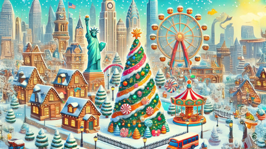 The Ferris wheel, carousel, and candy-themed decorations bring the joy of the season to life. The iconic city buildings are beautifully adorned with lights and festive accents, blending tradition with modern charm.