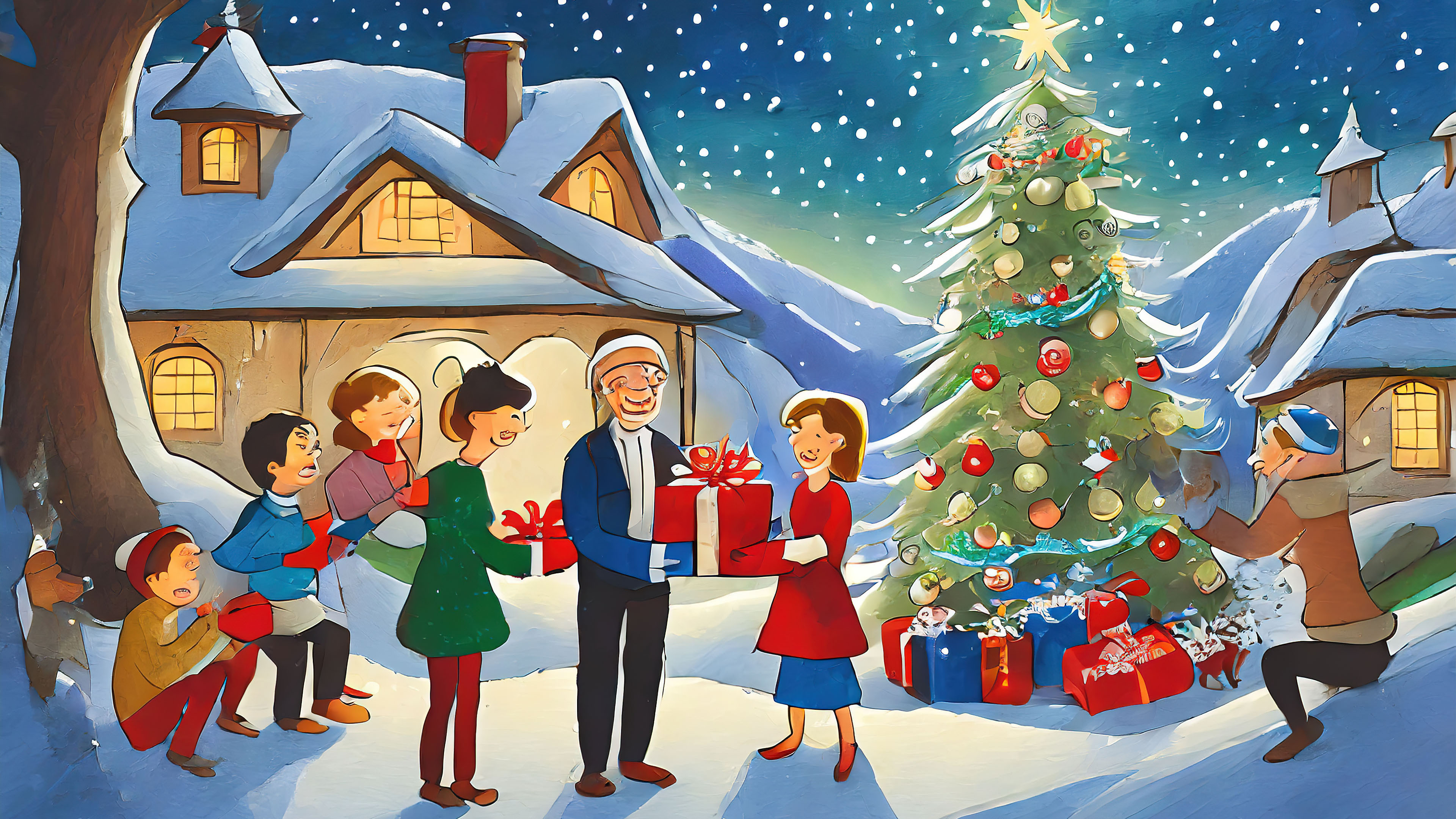 Delve into the glowing ambiance of festive lights as the Christmas tree illuminates the gathering. Explore the twinkling lights, the reflections on ornaments, and the overall sense of warmth and festivity that comes with the magical glow, creating a scene of joy and togetherness for the whole family.