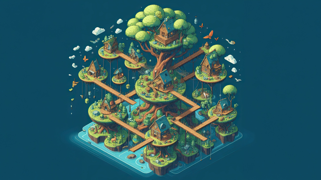 Suspended high above serene waters, this treehouse village boasts intricate wooden pathways connecting charming houses nestled in lush greenery.