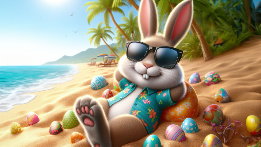 Get ready for a dose of laughter with this funny bunny as it lounges on the beach, soaking up the sun and spreading holiday cheer with its whimsical antics. With an egg as its throne, the bunny brings joy and laughter to all who encounter it.