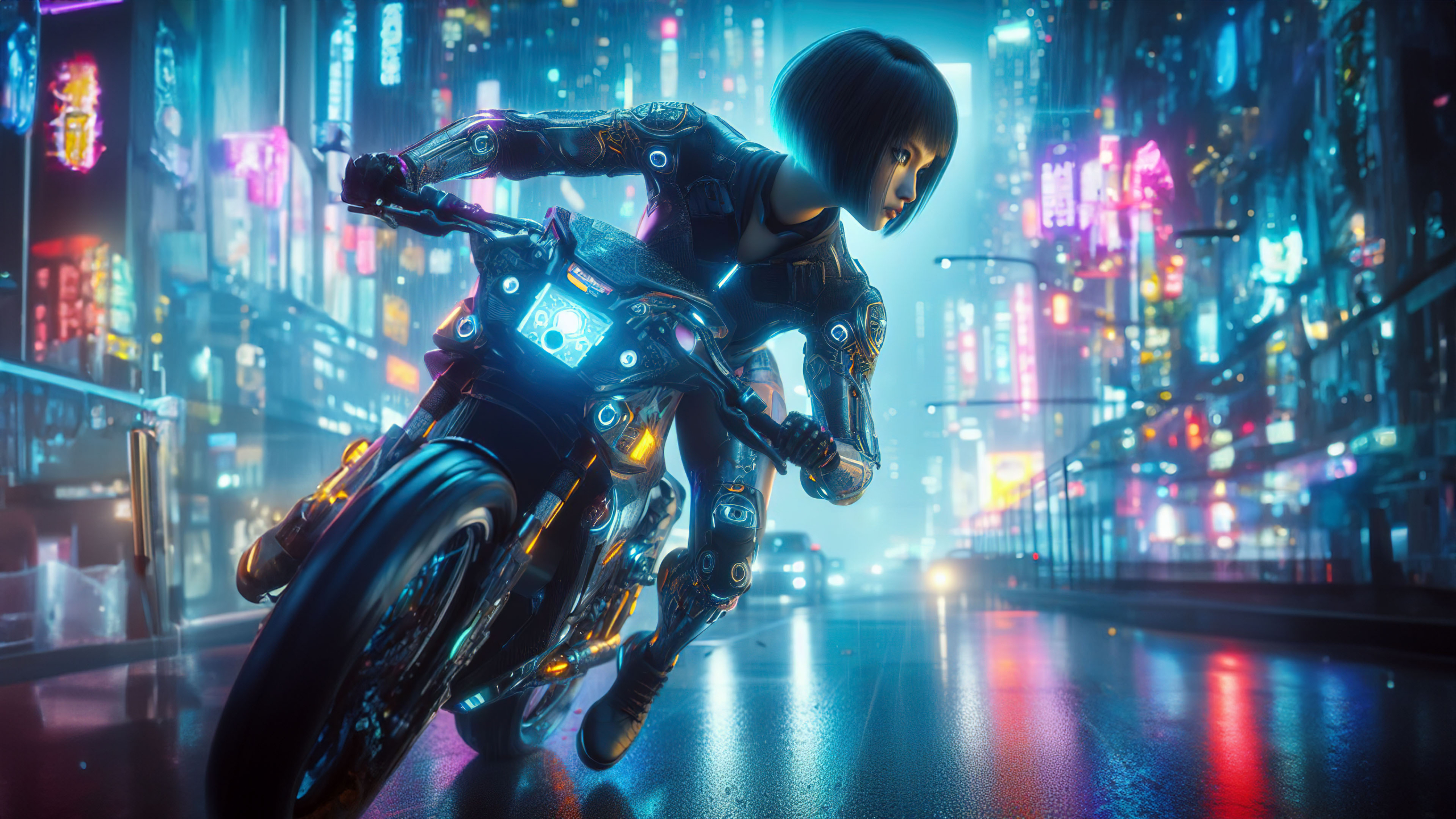 Step into the world of tomorrow with this captivating wallpaper showcasing a futuristic scene on a motorcycle. As the sleek and stylish vehicle cuts through the neon-lit streets, the woman at the helm exudes confidence and determination.