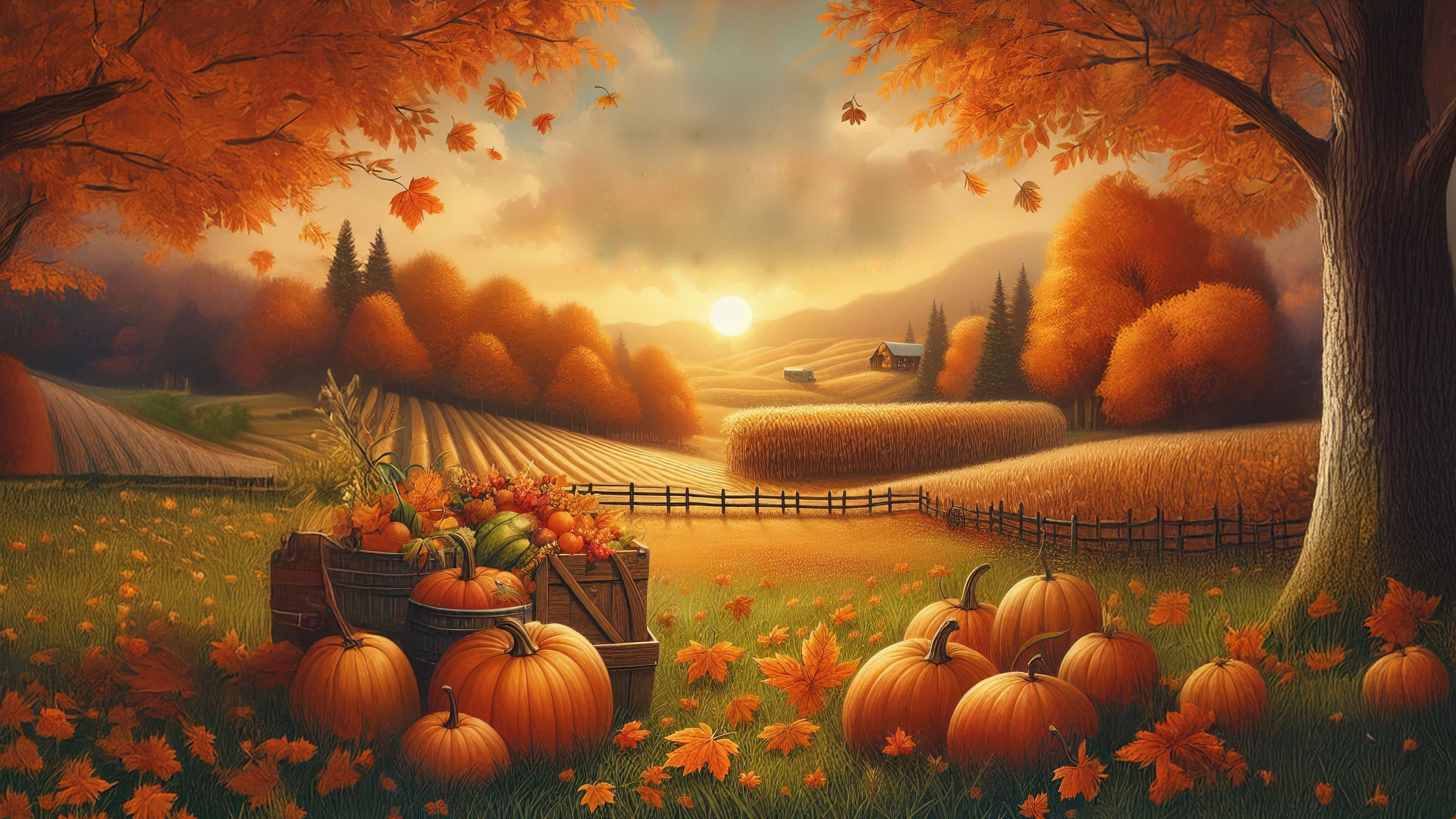 This beautiful wallpaper captures the essence of a tranquil autumn farm. Rolling fields stretch into the distance, bathed in the warm glow of a golden sunset. Pumpkins are scattered throughout the scene, complemented by vibrant orange leaves falling gently from the trees.