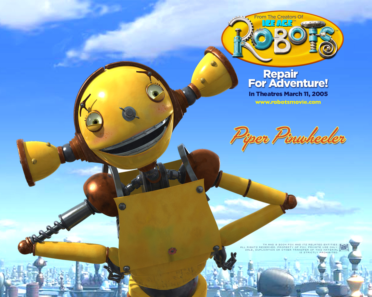 Academy Award winning director Chris Wedge ("Bunny," "Ice Age") brings his innovative filmmaking magic to "Robots," taking the animated feature film genre to a new, exciting level. For the first time ever, an animated feature presents a unique, totally imagined world – a wondrously clanky universe populated solely by mechanical beings. And never has a cast of this caliber -- encompassing no less than five Oscar winners, as well as Emmy and Tony honorees -- been brought together for an animated feature. In the film you'll meet memorable 'bots Rodney Copperbottom (Ewan McGregor), a young genius inventor who dreams of making the world a better place; Cappy (Halle Berry), a beautiful executive 'bot with whom Rodney is instantly smitten; the nefarious corporate tyrant Ratchet (Greg Kinnear) who locks horns with Rodney; Bigweld (Mel Brooks), a master inventor who has lost his way; and a group of misfit ‘bots known as the Rusties, led by Fender (Robin Williams) and Piper Pinwheeler (Amanda Bynes).