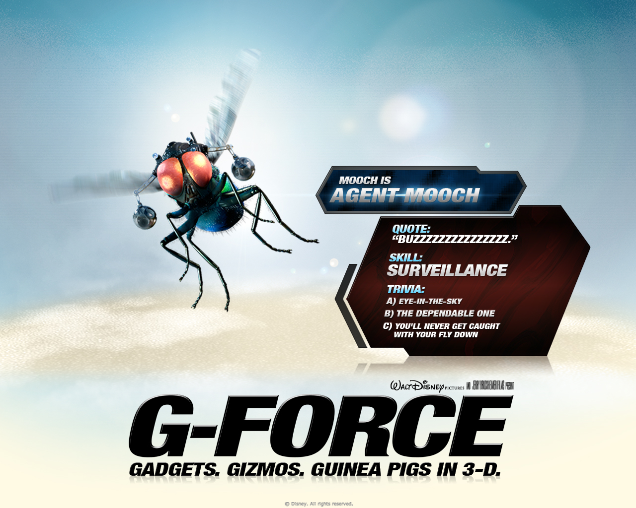 Producer Jerry Bruckheimer brings his first 3-D film to the big screen with "G-Force," a comedy adventure about the latest evolution of a covert government program to train animals to work in espionage. Armed with the latest high-tech spy equipment, these highly trained guinea pigs discover that the fate of the world is in their paws. Tapped for the G-Force are guinea pigs Darwin (voice of Sam Rockwell), the squad leader determined to succeed at all costs; Blaster (voice of Tracy Morgan), an outrageous weapons expert with tons of attitude and a love for all things extreme; and Juarez (voice of Penelope Cruz), a sexy martial arts pro; plus the literal fly-on-the-wall reconnaissance expert, Mooch, and a star-nosed mole, Speckles (voice of Nicolas Cage), the computer and information specialist.