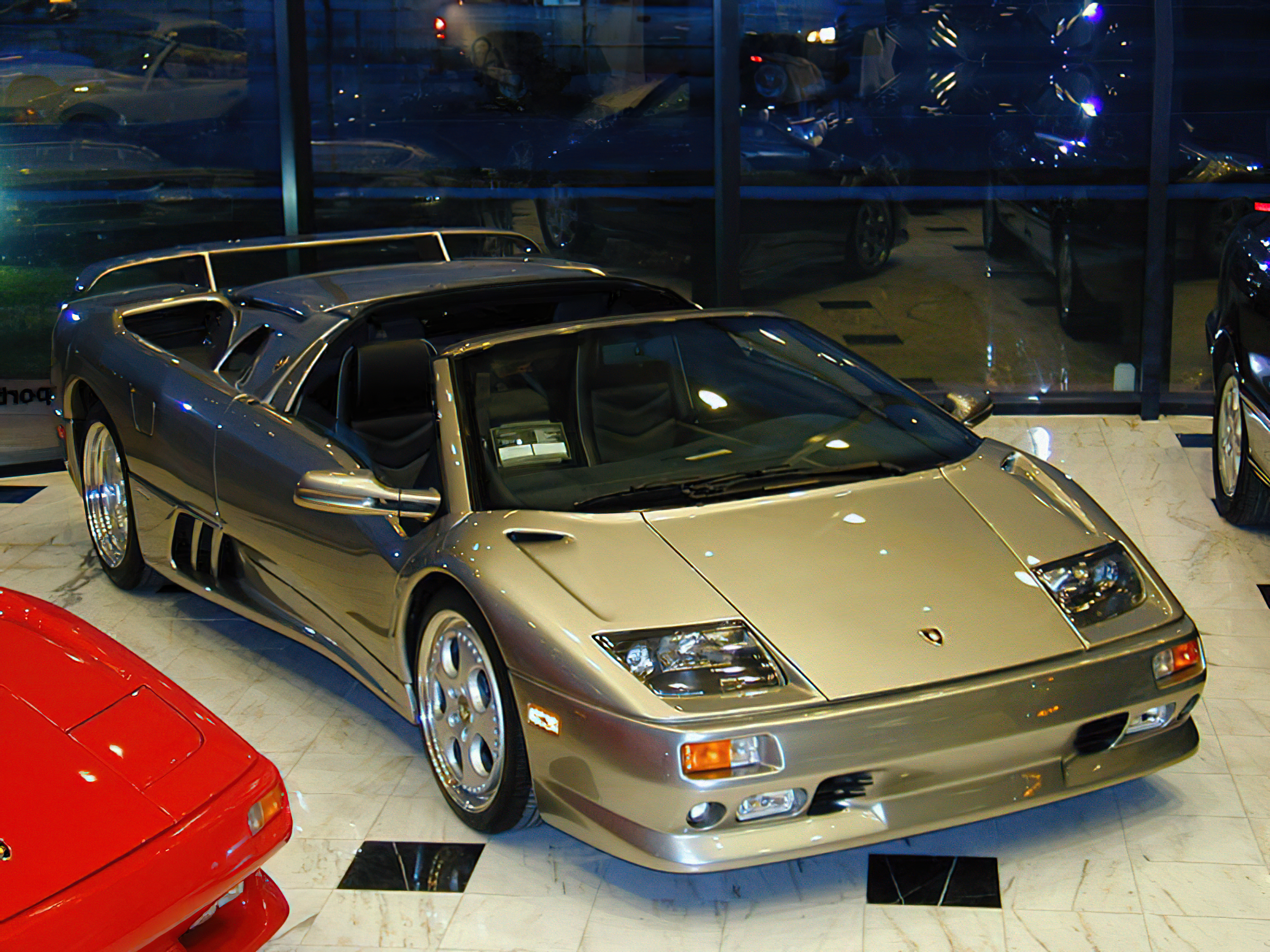 Sleek Silver Beauty: The 1999 Lamborghini Diablo in a Retail Showroom