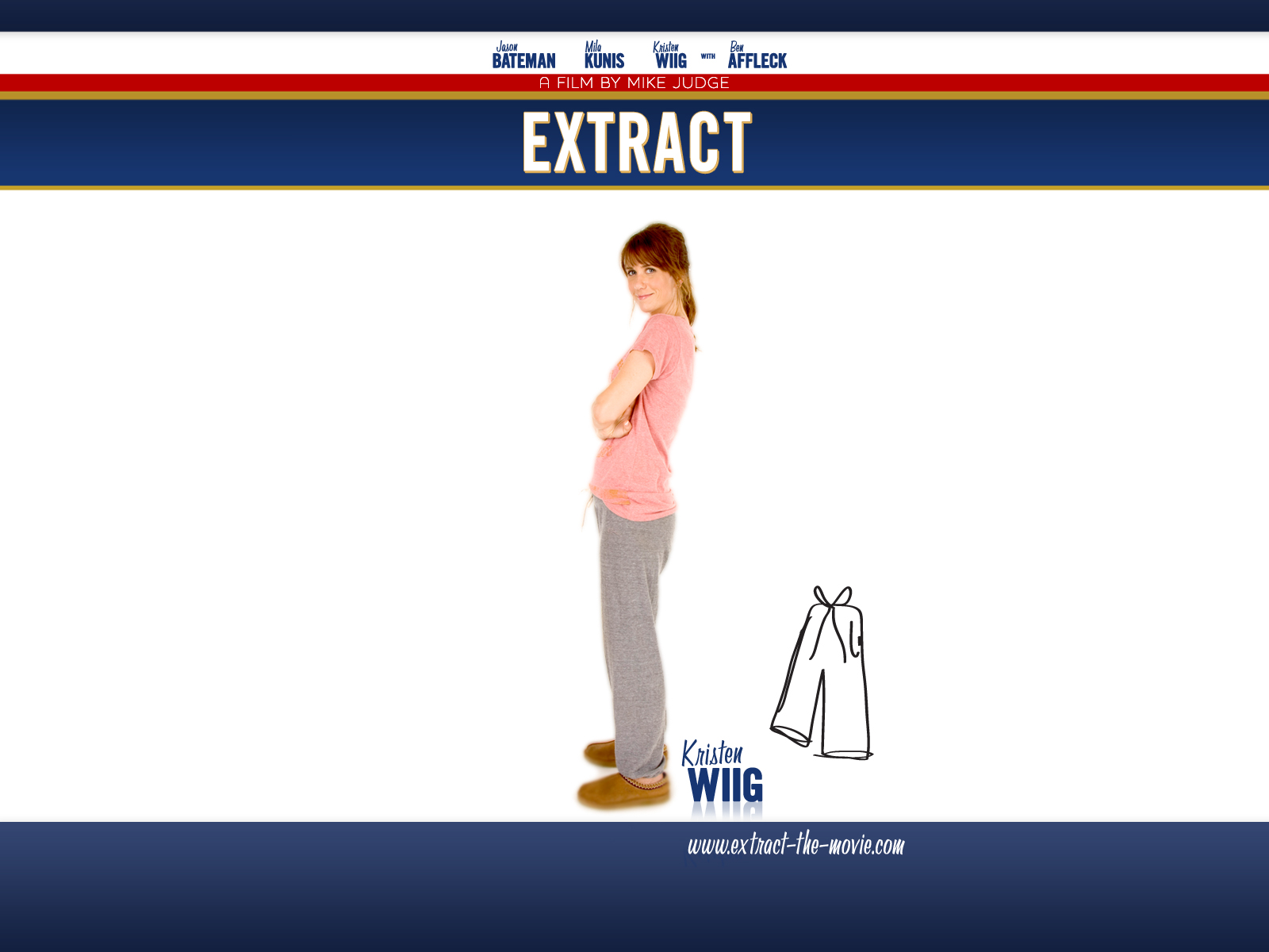 n EXTRACT, writer/director Mike Judge (“Beavis and Butt-Head,” “King of the Hill”) returns to the fertile territory of the American workplace, rotating his perspective away from the white collar cubicle warriors of “Office Space” and towards a blue collar boss – a small business owner – who employs an odd cast of losers, loners and misfits in his flavor extract factory.To the outside eye, Joel Reynold (Jason Bateman) seems to have everything. After all, being the owner of a business he built from the ground up - with its patented brand of culinary extracts - should make the “Extract King” a happy man.However, if Joel hasn’t reached his front door by 8 o’clock, he’ll find his wife, Suzie (Kristen Wiig) cinching up her sweatpants – and about as interested in him as he is in her mastery of supermarket coupon design. Sexually frustrated, Joel confides in his best pal, Dean (Ben Affleck), a barkeep – and soon finds himself wrapped up in a convoluted scheme to make Suzie cheat on him first with a dim-witted gigolo (Dustin Milligan) – thereby allowing him to pursue beautiful new employee Cindy (Mila Kunis) with a clear conscience. Unbeknownst to Joel, the object of his affections is a con artist/sociopath - just one step away from having her parole revoked. Meanwhile, Joel and his second-in-command, Brian (J.K. Simmons) have entered negotiations for a buyout of Reynold Extracts by General Mills. All they need to do is keep things tidy, quiet and moving while waiting for the final offer. Of course, this fails to take into account the employees on the factory floor: Step (Clifton Collins, Jr.), a machismo-ridden doofus and self-proclaimed “fastest sorter” with lofty aspirations of rising to Floor Manager; Rory (T.J. Miller), a goth-rock geek who spends more time passing out flyers for his band than shuffling extract bottles; and Mary (Beth Grant), a fanny-packed, bitter slouch at the end of the assembly line who’d rather fold her arms and shake her head than keep life at Reynold moving along – which is exactly what she’s doing when a bottleneck occurs on the line, resulting in a chain of accidents that cost poor Step a portion of his manhood.Seeing a big payday, the con-artist temp woos the otherwise-loyal Step, convincing him to sue for millions, engaging bus bench lawyer Joe Adler (KISS’s Gene Simmons) to “fight for his rights” – regardless of the fact that doing so will cost Joel the factory.With his dry wit and remarkable ear for character and dialogue, Mike Judge brings his trademark “flavor” to these seemingly disparate threads, tying them together into an antic comedy about life in the middle. Miramax Films presents a 3 Arts Entertainment/Ternion Productions film by Mike Judge. EXTRACT stars Jason Bateman, Kristen Wiig, Ben Affleck, Mila Kunis, J.K. Simmons, David Koechner, Clifton Collins, Jr., T.J. Miller, Beth Grant and Gene Simmons. The film is written and directed by Mike Judge, and is produced by John Altschuler and Michael Rotenberg, executive produced by Dave Krinsky, Tom Lassally and Glenn Lucas, and co-executive produced by Michael Flynn. Director of photography is Tim Suhrsted, and the production designer is Maher Ahmad. Visual Effects by Pixel Magic. Film editor is Julia Wong. Original music for the film composed by George S. Clinton. Distributed by Miramax Films.