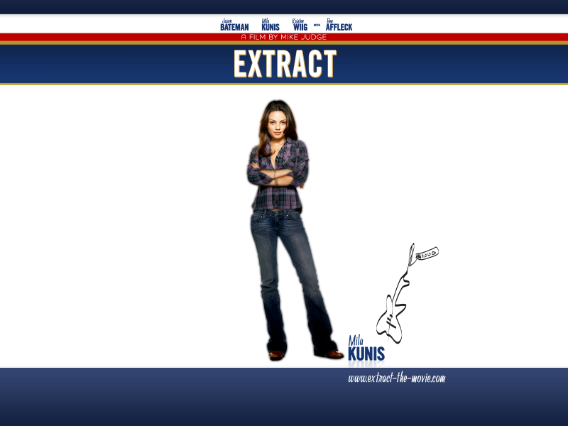 n EXTRACT, writer/director Mike Judge (“Beavis and Butt-Head,” “King of the Hill”) returns to the fertile territory of the American workplace, rotating his perspective away from the white collar cubicle warriors of “Office Space” and towards a blue collar boss – a small business owner – who employs an odd cast of losers, loners and misfits in his flavor extract factory.To the outside eye, Joel Reynold (Jason Bateman) seems to have everything. After all, being the owner of a business he built from the ground up - with its patented brand of culinary extracts - should make the “Extract King” a happy man.However, if Joel hasn’t reached his front door by 8 o’clock, he’ll find his wife, Suzie (Kristen Wiig) cinching up her sweatpants – and about as interested in him as he is in her mastery of supermarket coupon design. Sexually frustrated, Joel confides in his best pal, Dean (Ben Affleck), a barkeep – and soon finds himself wrapped up in a convoluted scheme to make Suzie cheat on him first with a dim-witted gigolo (Dustin Milligan) – thereby allowing him to pursue beautiful new employee Cindy (Mila Kunis) with a clear conscience. Unbeknownst to Joel, the object of his affections is a con artist/sociopath - just one step away from having her parole revoked. Meanwhile, Joel and his second-in-command, Brian (J.K. Simmons) have entered negotiations for a buyout of Reynold Extracts by General Mills. All they need to do is keep things tidy, quiet and moving while waiting for the final offer. Of course, this fails to take into account the employees on the factory floor: Step (Clifton Collins, Jr.), a machismo-ridden doofus and self-proclaimed “fastest sorter” with lofty aspirations of rising to Floor Manager; Rory (T.J. Miller), a goth-rock geek who spends more time passing out flyers for his band than shuffling extract bottles; and Mary (Beth Grant), a fanny-packed, bitter slouch at the end of the assembly line who’d rather fold her arms and shake her head than keep life at Reynold moving along – which is exactly what she’s doing when a bottleneck occurs on the line, resulting in a chain of accidents that cost poor Step a portion of his manhood.Seeing a big payday, the con-artist temp woos the otherwise-loyal Step, convincing him to sue for millions, engaging bus bench lawyer Joe Adler (KISS’s Gene Simmons) to “fight for his rights” – regardless of the fact that doing so will cost Joel the factory.With his dry wit and remarkable ear for character and dialogue, Mike Judge brings his trademark “flavor” to these seemingly disparate threads, tying them together into an antic comedy about life in the middle. Miramax Films presents a 3 Arts Entertainment/Ternion Productions film by Mike Judge. EXTRACT stars Jason Bateman, Kristen Wiig, Ben Affleck, Mila Kunis, J.K. Simmons, David Koechner, Clifton Collins, Jr., T.J. Miller, Beth Grant and Gene Simmons. The film is written and directed by Mike Judge, and is produced by John Altschuler and Michael Rotenberg, executive produced by Dave Krinsky, Tom Lassally and Glenn Lucas, and co-executive produced by Michael Flynn. Director of photography is Tim Suhrsted, and the production designer is Maher Ahmad. Visual Effects by Pixel Magic. Film editor is Julia Wong. Original music for the film composed by George S. Clinton. Distributed by Miramax Films.