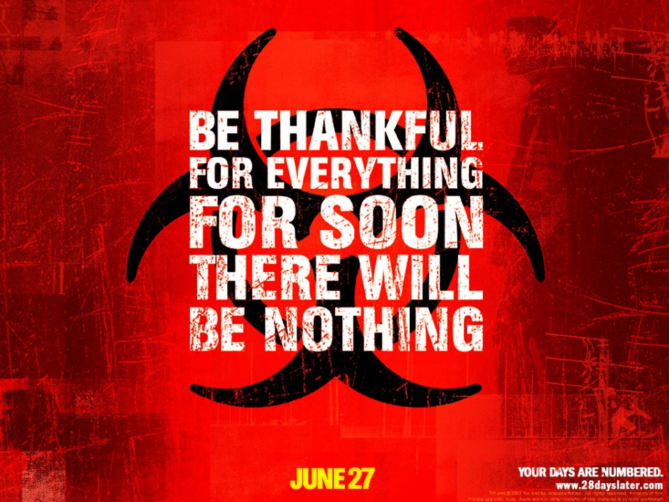 A powerful virus is unleashed on the British public following a raid on a primate research facility by animal rights activists. Transmitted in a drop of blood and devastating within seconds, the virus locks those infected into a permanent state of murderous rage. Within 28 days the country is overwhelmed and a handful of survivors begin their attempts to salvage a future, little realizing that the deadly virus is not the only thing that threatens them... (Source: comingsoon.net)