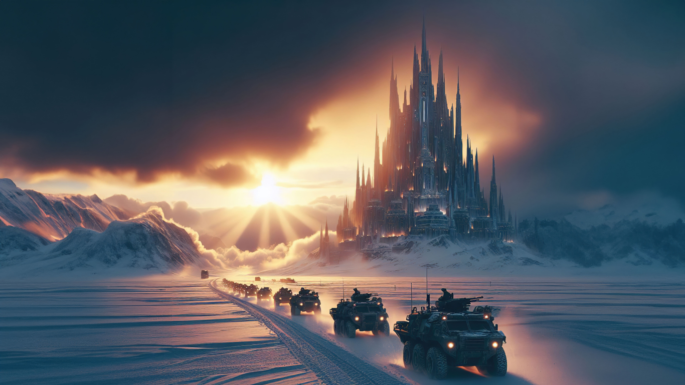 Experience the grandeur of this digital masterpiece showcasing a frozen citadel emerging from an endless snowy horizon.