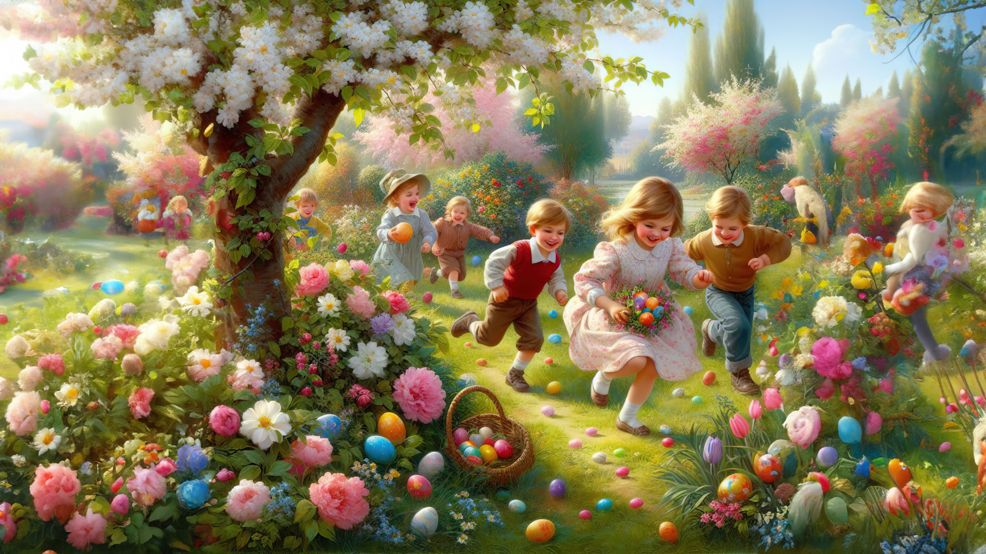 Immerse yourself in the festive atmosphere of this wallpaper, as colorful eggs and springtime flowers adorn the scene. The kids' laughter and enthusiasm add to the joy of the occasion, making it the perfect backdrop for your device.