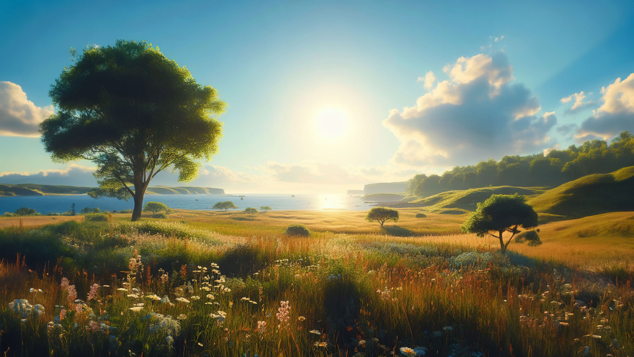 Immerse yourself in the tranquil beauty of our Meadow with Tree and Ocean Wallpaper. This captivating scene combines the charm of a lush meadow, the elegance of a solitary tree, and the vastness of the ocean in the background. Download this wallpaper to bring the serene beauty of nature to your screen.