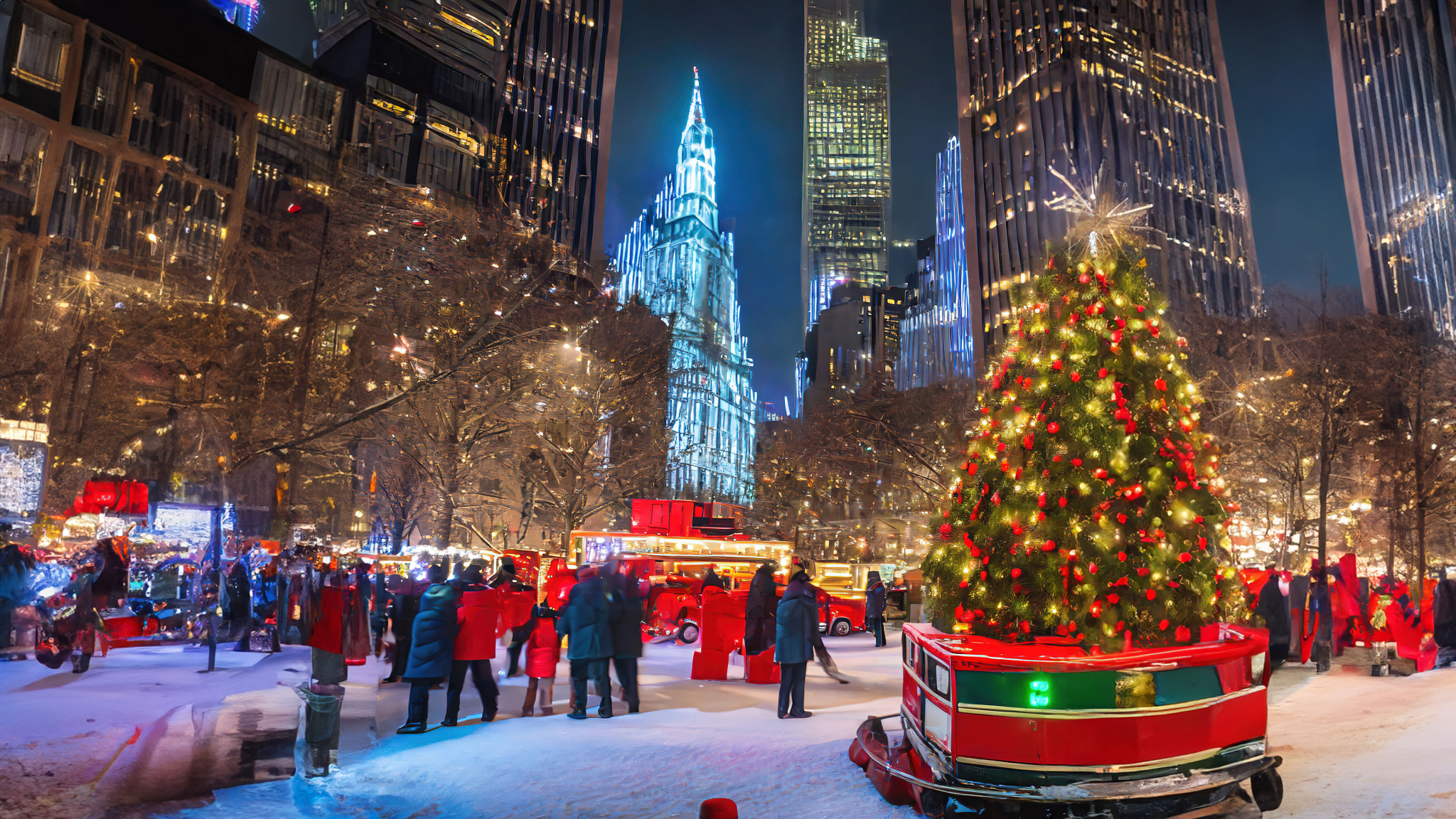 Experience Christmas night in the bustling city with a metropolitan glow, a magical scene celebrating a skyline aglow with festive lights, crowds adorned in holiday cheer, celebratory street performances, a cityscape alive with the spirit of the season, and the overall delightful spirit that makes the urban celebration during the holiday season a vibrant and enchanting experience for all.