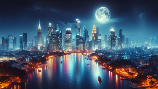 The city's skyline boasts cutting-edge designs, creating a perfect balance between innovation and beauty under the serene glow of moonlight.