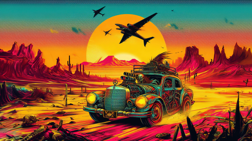 Welcome to a world where creativity meets chaos. This post-apocalyptic scene showcases a custom-built road warrior speeding through a vibrant desert wasteland as the sun sets in the background.