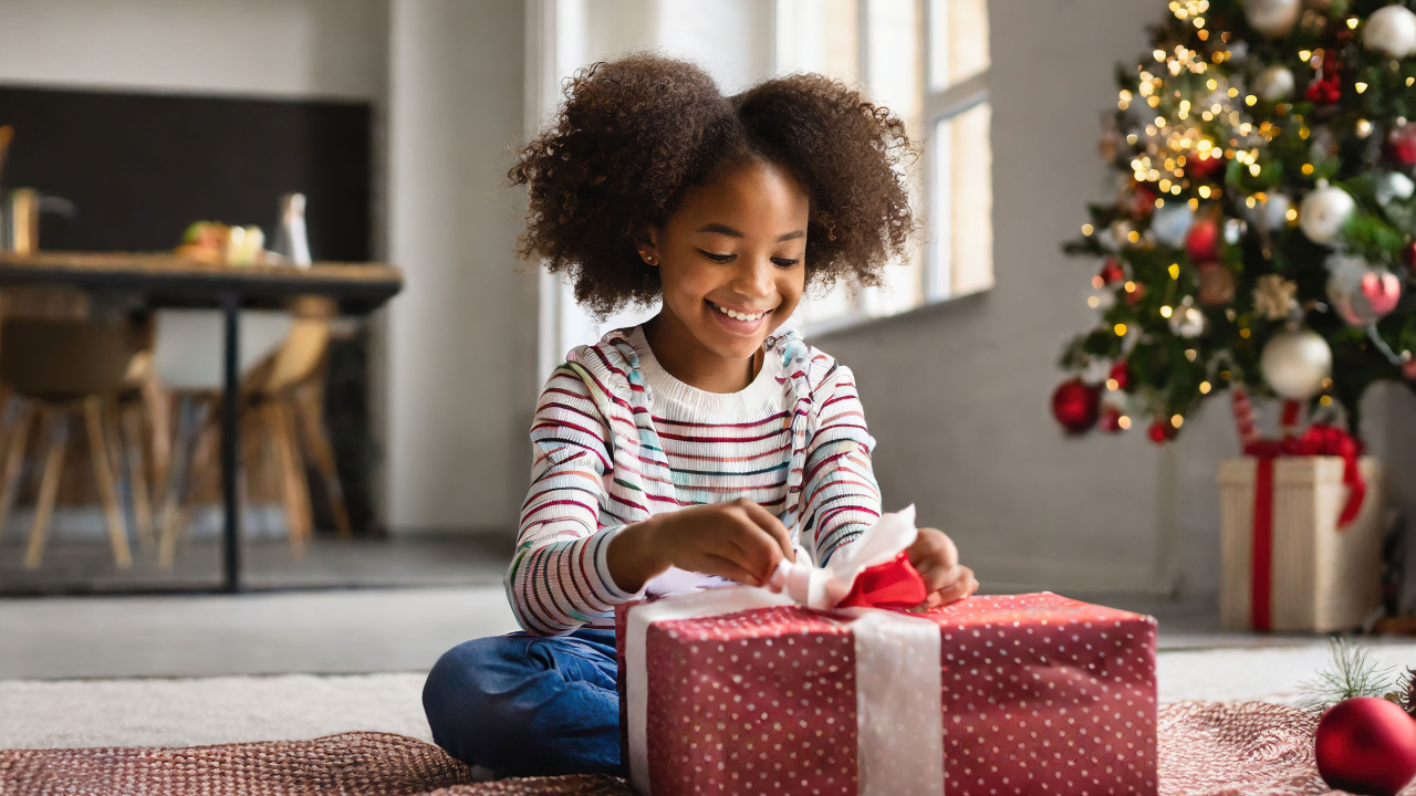 Experience pure joy with a little girl opening a gift, a magical moment celebrating eyes wide open to excitement, the unveiling of surprise, shared moments of celebration, wonder and amazement in small packages, and the overall delightful spirit that makes the act of gift unwrapping a heartwarming and enchanting experience for all.