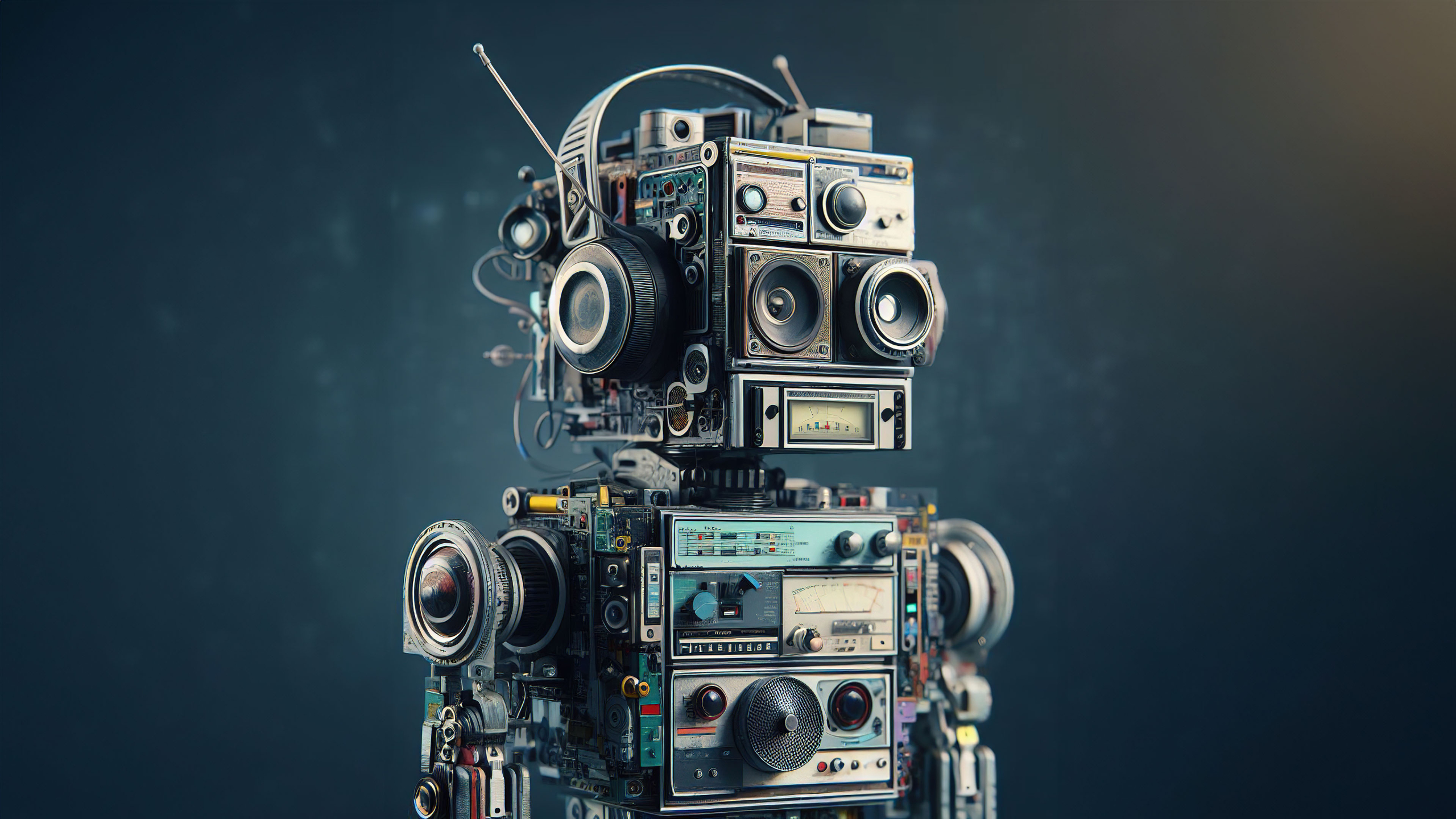 This unique artwork showcases a robot made from classic audio and visual devices, embodying the spirit of retro tech ingenuity.