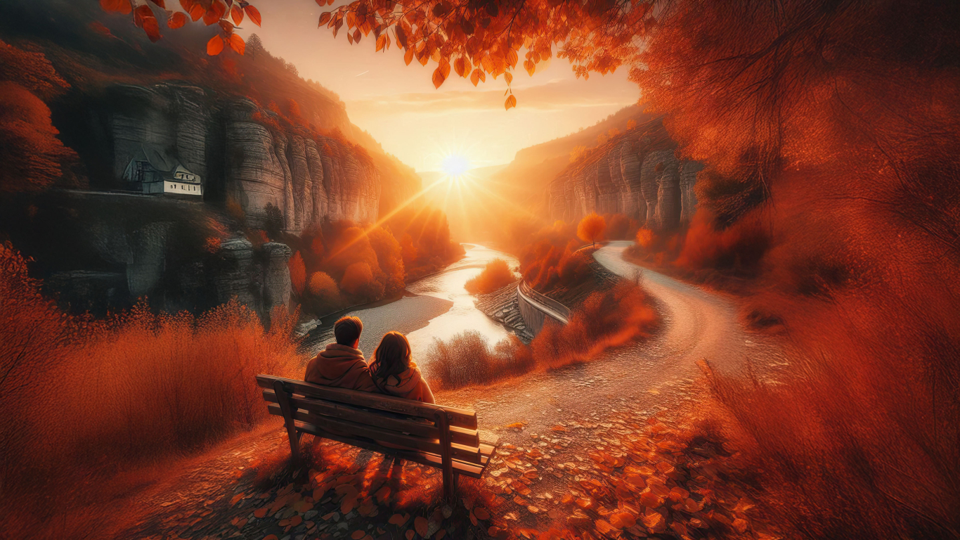 Golden leaves dance in the breeze as the setting sun casts a warm glow over the landscape, making this scene a perfect escape into autumn's embrace.