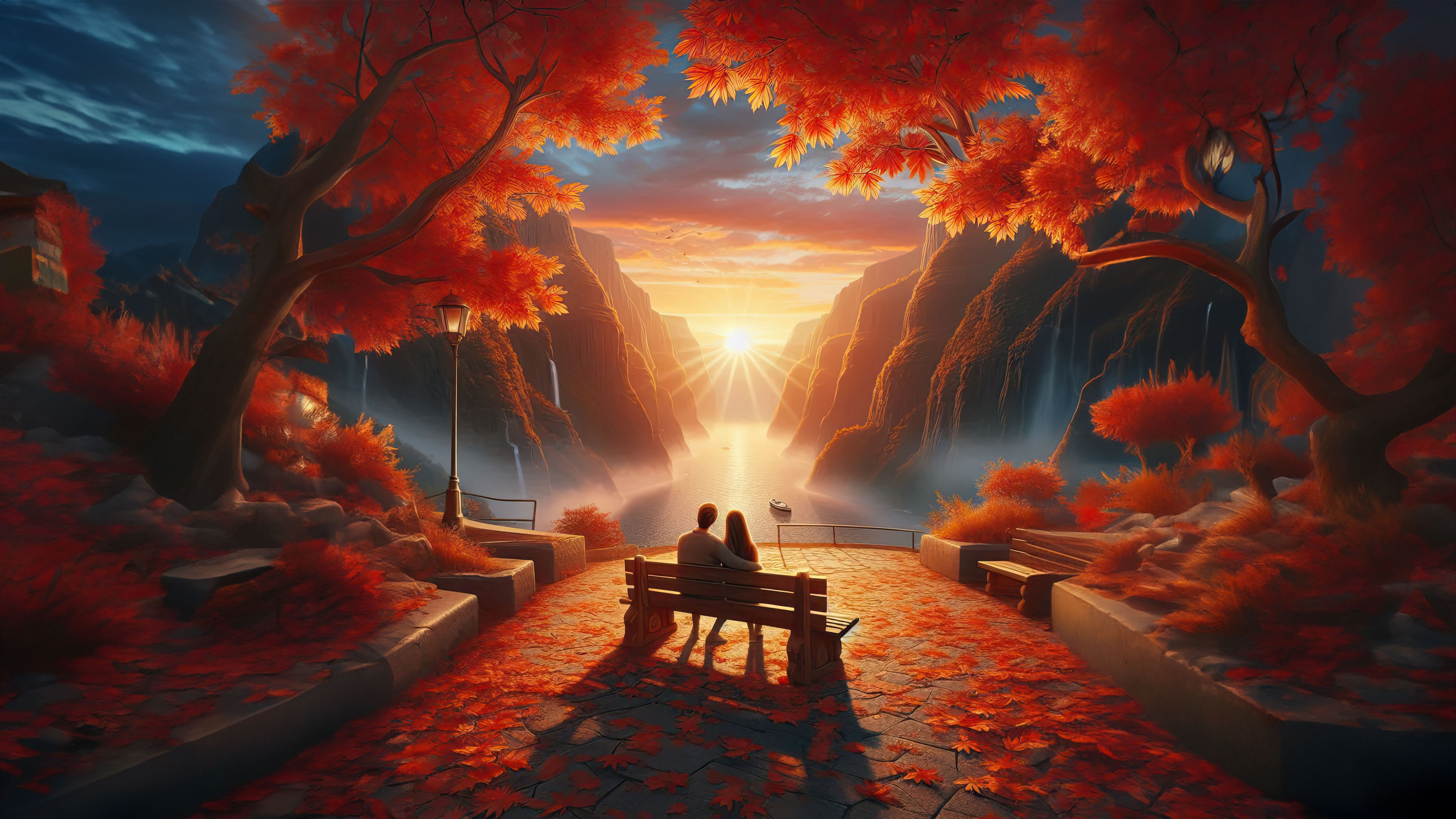This captivating wallpaper features a romantic autumn setting with a couple sitting on a bench, gazing at a glowing sunset over a serene valley. The vibrant red leaves of the trees frame the scene, adding a sense of warmth and intimacy to the breathtaking landscape.